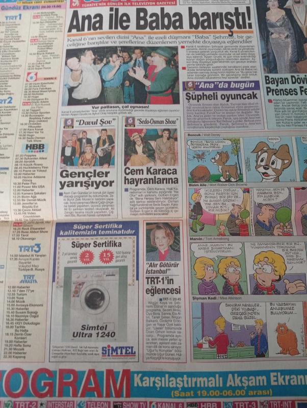 SABAH MELODİ GAZETESİ VE SABAH TELERAMA GAZETESİ KADINLARA ÖZEL GAZETESİ - 17 Nisan 1993-Karikatürler-Walt Disney/Boncuk-Mort Walker-Dick Browne/Bizim Aile-Tom Armstrong/Marvin-Graham Allen-John Dodd/Kral Kedi-Süleyman Turan/Dön Artık-Astroloji-Bülent Kısa-Klinik-Meltem Pusat-Telerama Programı-Sabah Filmleri-Öğlen Filmleri- akşam filmleri- Barış manço-bülent ersoy-aşkın Nur Yengi- seyyal Taner- alize Kaya- Sibel Mutlu- gözde Öz koca- ertürk Ergenekon- emin divrik-çiğdem Tunç- ali öztürk-volkan severcan- gülben ergen-erdoğan sevgin- gülbahar merdivan kısa çizgisi Belcan kısa çizgisi belge ökçe-aslıhan öncü-pınar eli çek- semra Sökmen- İlyas Salman- yasemin Öymen- Nükhet duru-fikret hakan-faruk peker-ilyas salman-özlem Onursal- aram Gül yüz-sadece alışık-neriman Köksal- behçet nacar-neriman Köksal- full 2 saner-sadri alışık-çolpan ilhan-süreyya Duru- cüneyt arkın-sezer Güvenirgil- Süleyman turan-bülent kısa-meltem Pusat- adlı eser, Kitap > Süreli Yayınlar > Gazeteler > Türkiye > Genel > Günlük kategorisinde İkinci El olarak satıştadır.