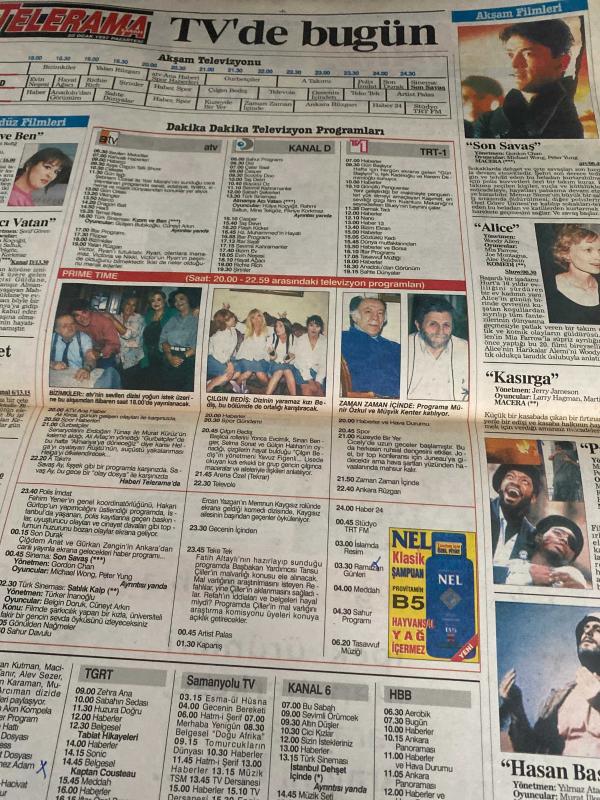 SABAH MELODİ GAZETESİ VE SABAH TELERAMA GAZETESİ KADINLARA ÖZEL GAZETESİ DOĞUM GÜNÜ GAZETESİ - 20 Ocak 1997 -Karikatürler-Walt Disney/Boncuk-Mort Walker-Dick Browne/Bizim Aile-Tom Armstrong/Marvin-Graham Allen-John Dodd/Kral Kedi-Süleyman Turan/Dön Artık-Astroloji-Bülent Kısa-Klinik-Meltem Pusat-Telerama Programı-Sabah Filmleri-Öğlen Filmleri- akşam filmler-Sarıhan iç ve dış ticaret-Hüseyin hatemi-Savaş Ay-A takımı-Nihal Mete-Mehmet Ali birand-İpek mobilya-Hülya Koçyiğit-Erdoğan Sevgi-tınaz titiz-Ayşe Özgün-Erdoğan Tünaş-Çılgın Bediş-yolcu Evcimik-behçet cantürk-pınar Çekirge- Gülşen Bubikoğlu-Cüneyt Arkın-ve ben-Almanya acı vatan-rahmi Saltuk-fikriye Korkmaz-İstanbul Reşit içinde-Ayhan Işık-Figen Sait-zirve-Faruk peker-Yaman vuran-Kenan Pars-Zaman zaman içinde-Müşvik kenter-Münir Özkul adlı eser, Kitap > Süreli Yayınlar > Gazeteler > Türkiye > Genel > Günlük kategorisinde İkinci El olarak satıştadır.