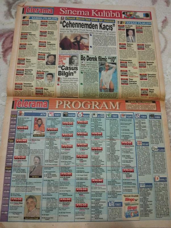 SABAH MELODİ TELERAMA TÜRKİYE'NİN GÜNLÜK TEK TELEVİZYON GAZETESİ -14 Mayıs 1994 - Dön Artık Süleyman Turan-Püf Noktası-astroloji-bülent kısa-Klinik -yöneten meltem pusat-boncuk/Walt Disney -bizim aile/mort Walker -dick browne-marvin/Tom armstrong-kral kedi/Graham Allen -john dodd-Sabah Filmleri-Akşam Filmleri -Program-vatandaşın çilesi-ismi lazım değil-levent kırca-tansu çiller-cumhurbaşkanı Süleyman demirel-gaye akçıl-pazar keyfi-doktor murat-19 Mayıs şöleni-yonca evcimik-coca cola-safiye Ayla ile gençlik-can gürzap-gülsen tuncer-bayram göbeği-zinnur karaca-fuhuş operasyonu-kurtuluş ulusal egemenlikte-gizli telefon görüşmesi-abdullah öcalan-leyla zana-aşk falınız-kurşun zehirlenmesi-tencere dibini tutmuşsa-gümüşleri parlatmak için-suyun önemi-casus bilgin-cehennemden kaçış-yeni bir gün-anılar-kartal tibet-zeynep aksu-asla vazgeçme-çanakkale aslanları-ajda pekkan-tanju gürsu-muzaffer tema-en büyük şaban-kemal sunal-3 kural-bermuda üçgeni-kur'an-ı kerim-hayırlı günler-yumurcak adlı eser, Kitap > Süreli Yayınlar > Gazeteler > Türkiye > Genel > Günlük kategorisinde İkinci El olarak satıştadır.