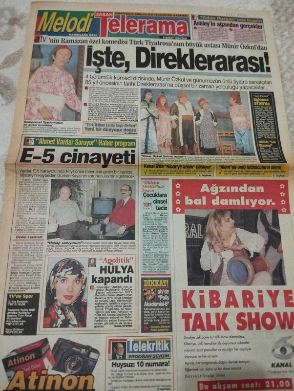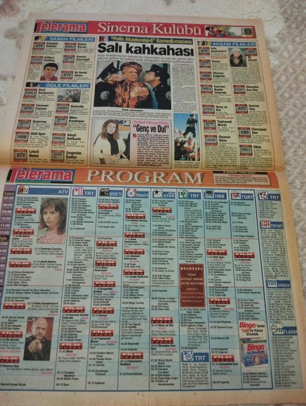 SABAH MELODİ TELERAMA TÜRKİYE'NİN GÜNLÜK TEK TELEVİZYON GAZETESİ-KADINLARA ÖZEL -8 Şubat 1994 - Dön Artık Süleyman Turan-Püf Noktası-astroloji-bülent kısa-Klinik -yöneten meltem pusat-boncuk/Walt Disney -bizim aile/mort Walker -dick browne-marvin/Tom armstrong-kral kedi/Graham Allen -john dodd-Sabah Filmleri-Akşam Filmleri -Program- yalan rüzgarı-münir özkul-türk tiyatrosu-salı pazarı-ahmet Vardar soruyor-e5 cinayeti-gürkan kaya-apolitik-hülya uğur-istanbul büyükşehir belediye başkan adayları-bedrettin dalan-ilhan kesici-tayyip Erdoğan-kibariye-erdoğan sevgin-çöpçatan-futbolcu alemleri-begüm özbek-cem özer-ssk Okmeydanı hastanesi başhekimi Kazım Sarı-çocuklarımızın kalbi tekliyor-buzdolabınız temiz koksun-tencerenin dibi tutmasın-çantanızı sırtınızda taşıyın-yeni bir dünya-haftanın sohbeti-polis akademisi-ilyas salman-pembe mutlu-eyüp dirlik-oyunun sonu-tophaneli murat-kadir inanır-nükhet egeli-ölümün eşiğinde-haberler-hayırlı günler-seni seviyorum adlı eser, Kitap > Süreli Yayınlar > Gazeteler > Türkiye > Genel > Günlük kategorisinde İkinci El olarak satıştadır.