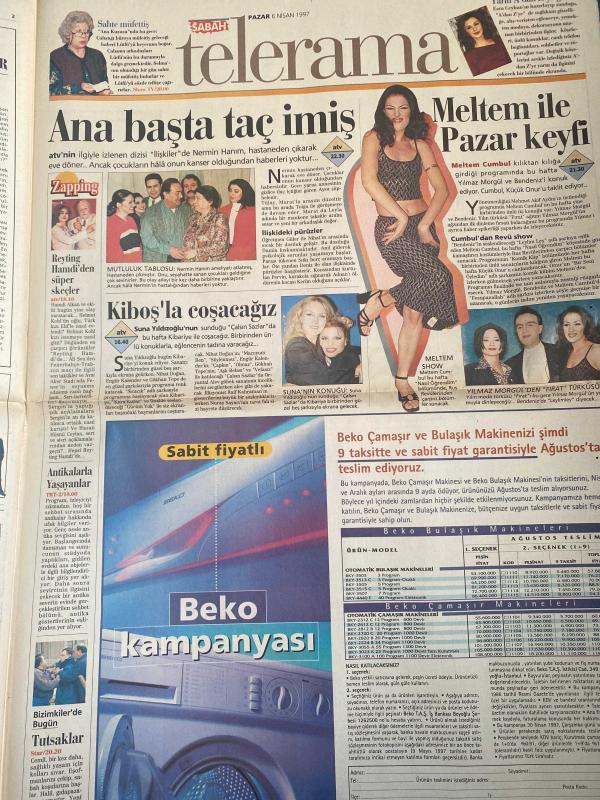 SABAH PAZAR MELODİ GAZETESİ VE SABAH TELERAMA GAZETESİ - 6 Nisan 1997 -Söyleyemedikleriniz-Süleyman Turan-Ah şu kocalar-Hale Pakcan-Mimi ile Muti-Patrıck Mc Donnel-Bizim Aile-Mort Walker-Dıck Browne-Marvın-Tom Amstrong-astroloji-Bugün ne yapalım-Erdoğan Sevgin-seda kaya Güler-Yılmaz Erdoğan-Jülide Ateş-Cemal Özgörkey—Volkan Severcan—Buket Dereoğlu-Lancome Paris-Elite Cosmetic-Diana ve Charles-Erol Evgin-emel Evgin-Aysun ve Ali Kocatepe çifti-reyting hamdi-an kuzusu-Esra Ceyhan-Meltem cumbul-Yılmaz morgül-Bendeniz-Suna yıldızoğlu-beko-bir demet menekşe-Zeki Ökten--Kartal Tibet-Hale Soygazi-Osman Seden-Hülya Avşar-Talat Bulut-Kenan kalav--Selin dilmen-şahane pazar adlı eser, Kitap > Süreli Yayınlar > Gazeteler > Türkiye > Genel > Günlük kategorisinde İkinci El olarak satıştadır.