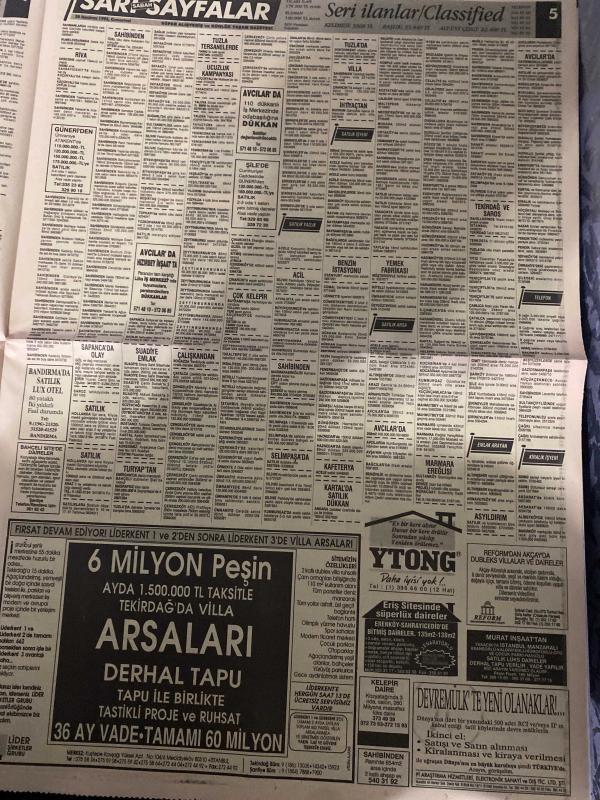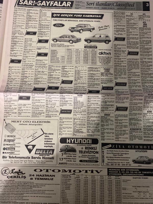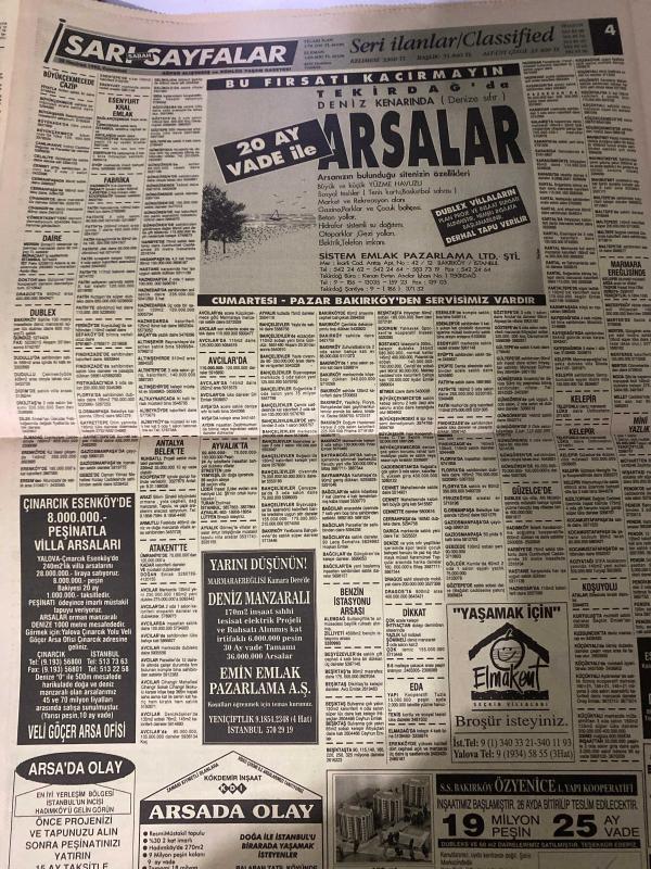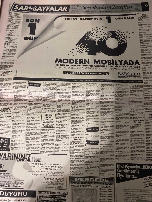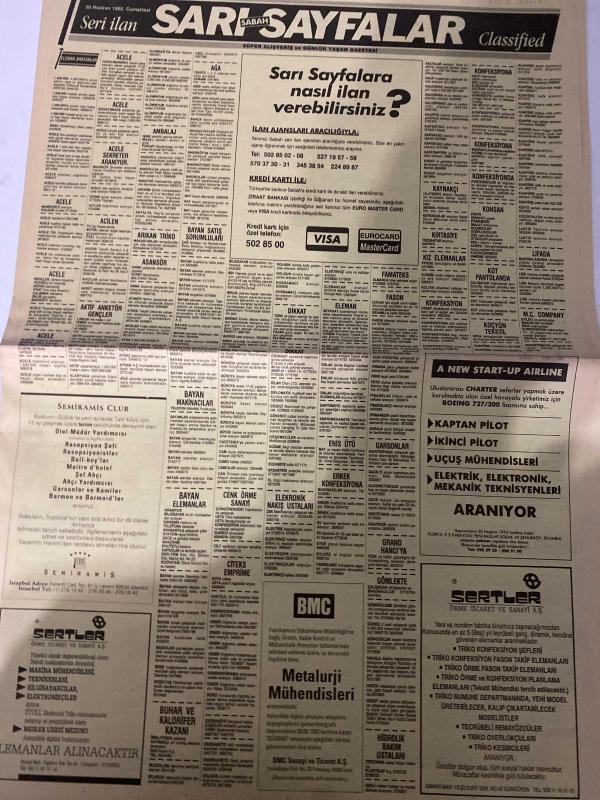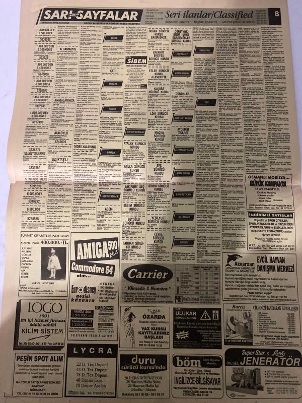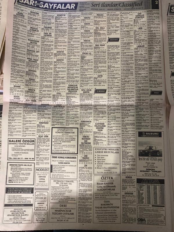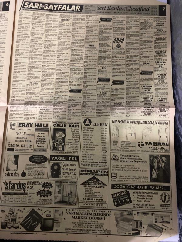 SABAH SARI SAYFALAR DOĞUM GÜNÜ GAZETESİ - 20 HAZİRAN1992 -Galeri Özgür Dayanıklı Tüketim Malları - Montekstil Tekstil San. Ltd. Şti. - Resat Giyim - Modelist - Sıçmoğlu Tekstil Tic. ve San. A.Ş. - ÖzteK - Nefa Tekstil - Turcan A.Ş. - ZSK - Suzuki - Veli Göçer Arsa Ofisi - Sistem Emlak Pazarlama Ltd. Şti. - Emin Emlak Pazarlama A.Ş. - Elmakent - Ytong - Reform - Murat İnşaat - Eray Halı - Çelik Kapı - Yağlı Tel - Pimapen - Ertex Tekstil - Stardus - Alarko - Elberk - Tasiran Pazarlama - Carrier - Amiga Commodore 64 - Eurodisney - Logo Kilim Sistem - Özarda Sürücü Kursu - Ulukar Sürücü Kursu - Duru Sürücü Kursu - Böm Bilim Öğretim Merkezi - Akvarsan - Burcu - Diesel Generator, Dinç Bilgin tarafından kaleme alınmıştır. SABAH SARI SAYFALAR DOĞUM GÜNÜ GAZETESİ - 20 HAZİRAN1992 -Galeri Özgür Dayanıklı Tüketim Malları - Montekstil Tekstil San. Ltd. Şti. - Resat Giyim - Modelist - Sıçmoğlu Tekstil Tic. ve San. A.Ş. - ÖzteK - Nefa Tekstil - Turcan A.Ş. - ZSK - Suzuki - Veli Göçer Arsa Ofisi - Sistem Emlak Pazarlama Ltd. Şti. - Emin Emlak Pazarlama A.Ş. - Elmakent - Ytong - Reform - Murat İnşaat - Eray Halı - Çelik Kapı - Yağlı Tel - Pimapen - Ertex Tekstil - Stardus - Alarko - Elberk - Tasiran Pazarlama - Carrier - Amiga Commodore 64 - Eurodisney - Logo Kilim Sistem - Özarda Sürücü Kursu - Ulukar Sürücü Kursu - Duru Sürücü Kursu - Böm Bilim Öğretim Merkezi - Akvarsan - Burcu - Diesel Generator adlı eser Türkçe dilindedir.