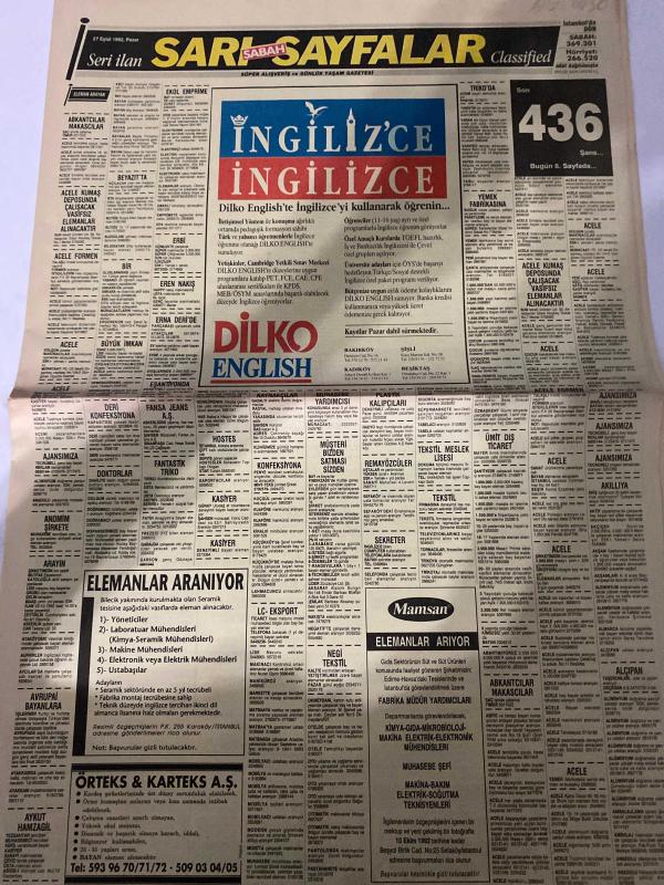 SABAH SARI SAYFALAR DOĞUM GÜNÜ GAZETESİ - 27 EYLÜL 1992 - Lider Şirketler Grubu - F.D. Tekstil - Softek - Ercan Gemi Sanayi - Rink Tekstil San. Tic. Ltd. Şti. - Arma Şirketler Grubu - Tetas Kes. Konf. San. Tic. A.Ş. - Fruttis - Eren Nakış - Erena Deri - Eteks Tekstil - Oerlikon - Serttaş Triko - Keriyan Emlak - Soma Torba Kömürü - Gözön Ön Lisans Kursları - Möm Bilgisayar - Özel Aysel Sürücü Kursu - Çapa Dershanesi - Ermak - Immergas - Mates -sigorta-pazarlama satış-avukat-bilgisayar-nöbetçi eczaneler-dershaneler-iletişim-emlakçılar-bahçelievler-halkalı-güngören-fındıkzade-florya-fatih-eyüp-gümüşsuyu-kemerburgaz-kasımpaşa-küçükçekmece-levent-sarıyer-kurtuluş-koca Mustafa paşa-gaziosmanpaşa-beşiktaş-beyoğlu-etkiler-avcılar-yeni köyü-tarabya-şişlik-rumeli hisar-sarıyer-realty world-ümraniye-maltepe-kadıköy-kiralık arayanlar-satılık iş yeri-kemer-yakacık-, Dinç Bilgin tarafından kaleme alınmıştır. SABAH SARI SAYFALAR DOĞUM GÜNÜ GAZETESİ - 27 EYLÜL 1992 - Lider Şirketler Grubu - F.D. Tekstil - Softek - Ercan Gemi Sanayi - Rink Tekstil San. Tic. Ltd. Şti. - Arma Şirketler Grubu - Tetas Kes. Konf. San. Tic. A.Ş. - Fruttis - Eren Nakış - Erena Deri - Eteks Tekstil - Oerlikon - Serttaş Triko - Keriyan Emlak - Soma Torba Kömürü - Gözön Ön Lisans Kursları - Möm Bilgisayar - Özel Aysel Sürücü Kursu - Çapa Dershanesi - Ermak - Immergas - Mates -sigorta-pazarlama satış-avukat-bilgisayar-nöbetçi eczaneler-dershaneler-iletişim-emlakçılar-bahçelievler-halkalı-güngören-fındıkzade-florya-fatih-eyüp-gümüşsuyu-kemerburgaz-kasımpaşa-küçükçekmece-levent-sarıyer-kurtuluş-koca Mustafa paşa-gaziosmanpaşa-beşiktaş-beyoğlu-etkiler-avcılar-yeni köyü-tarabya-şişlik-rumeli hisar-sarıyer-realty world-ümraniye-maltepe-kadıköy-kiralık arayanlar-satılık iş yeri-kemer-yakacık- adlı eser Türkçe dilindedir.