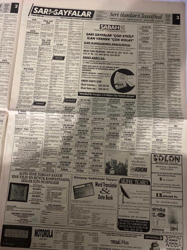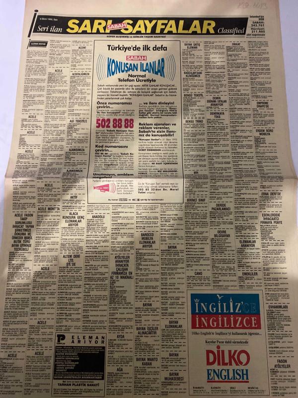 SABAH SARI SAYFALAR DOĞUM GÜNÜ GAZETESİ - 6 EKİM 1992 -Sabah - Bengü Tekstil - Bensu Triko - Erdem Büro Mobilya - Erna Deri - Tarhan Plastik Sanayi - Dilko English - Özbaş Kent Giyim - Ünüal Giyim - İzo-Mus - Askcom - Solon Bilgisayar Yazılım - Şirindus - Silifke Ticaret - Mehmet Keçeyaypan - Motorola - Yaman Otomotiv - Uygar Otomotiv - Samed Otomotiv - Şador Master Otomotiv - İpar Otomotiv - Pimapen - Medya Market - Çok-Dil Foreign Language Centre - Çapa Dershanesi - Özel Şahin Bilgi Eğitim Merkezi - Gözen Ön Lisans Kursları - Möm Möm - Akyıldız Dekorasyon - Yataş - Altın İğne Yorgan Sanayi adlı eser, Kitap > Süreli Yayınlar > Gazeteler > Türkiye > Genel > Günlük kategorisinde İkinci El olarak satıştadır.
