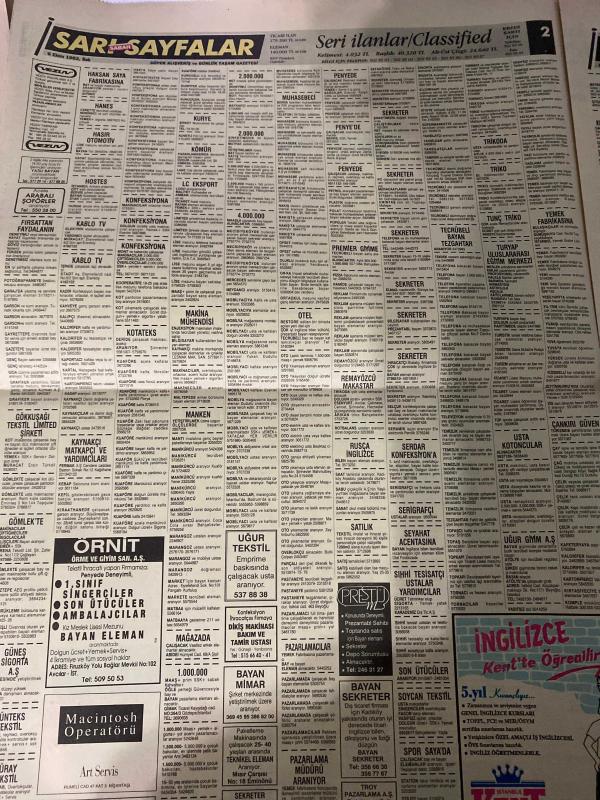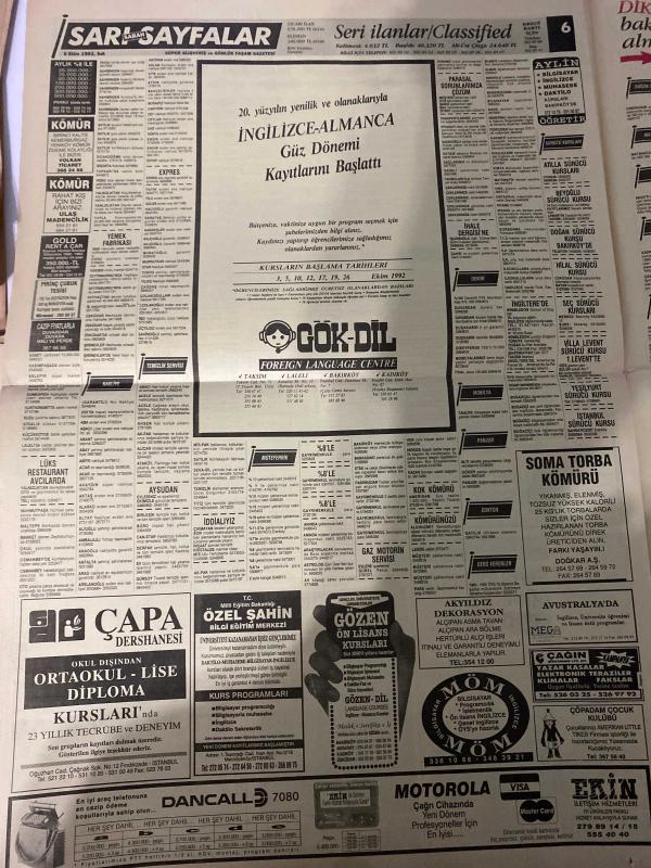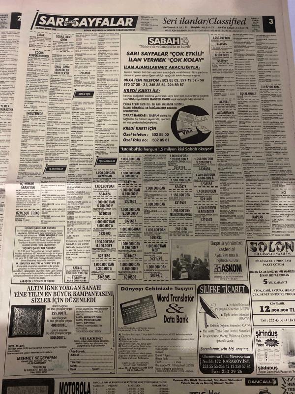 SABAH SARI SAYFALAR DOĞUM GÜNÜ GAZETESİ - 6 EKİM 1992 -Sabah - Bengü Tekstil - Bensu Triko - Erdem Büro Mobilya - Erna Deri - Tarhan Plastik Sanayi - Dilko English - Özbaş Kent Giyim - Ünüal Giyim - İzo-Mus - Askcom - Solon Bilgisayar Yazılım - Şirindus - Silifke Ticaret - Mehmet Keçeyaypan - Motorola - Yaman Otomotiv - Uygar Otomotiv - Samed Otomotiv - Şador Master Otomotiv - İpar Otomotiv - Pimapen - Medya Market - Çok-Dil Foreign Language Centre - Çapa Dershanesi - Özel Şahin Bilgi Eğitim Merkezi - Gözen Ön Lisans Kursları - Möm Möm - Akyıldız Dekorasyon - Yataş - Altın İğne Yorgan Sanayi, Dinç Bilgin tarafından kaleme alınmıştır. SABAH SARI SAYFALAR DOĞUM GÜNÜ GAZETESİ - 6 EKİM 1992 -Sabah - Bengü Tekstil - Bensu Triko - Erdem Büro Mobilya - Erna Deri - Tarhan Plastik Sanayi - Dilko English - Özbaş Kent Giyim - Ünüal Giyim - İzo-Mus - Askcom - Solon Bilgisayar Yazılım - Şirindus - Silifke Ticaret - Mehmet Keçeyaypan - Motorola - Yaman Otomotiv - Uygar Otomotiv - Samed Otomotiv - Şador Master Otomotiv - İpar Otomotiv - Pimapen - Medya Market - Çok-Dil Foreign Language Centre - Çapa Dershanesi - Özel Şahin Bilgi Eğitim Merkezi - Gözen Ön Lisans Kursları - Möm Möm - Akyıldız Dekorasyon - Yataş - Altın İğne Yorgan Sanayi adlı eser Türkçe dilindedir.