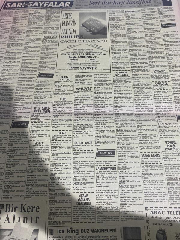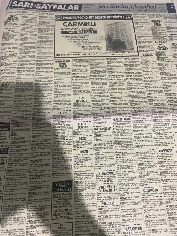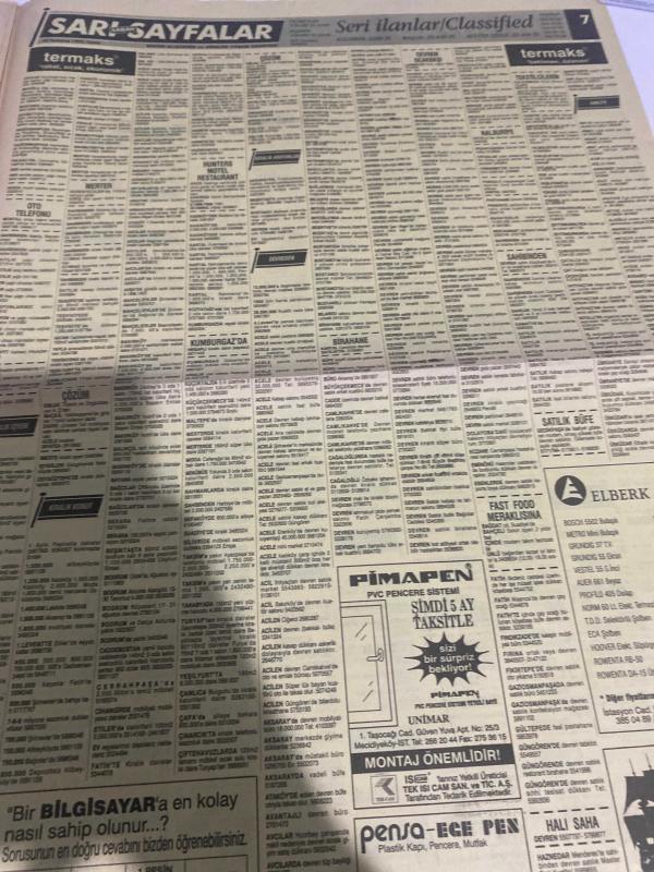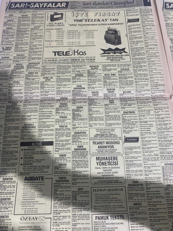 SABAH SARI SAYFALAR SERİ İLANLAR GAZETESİ DOĞUM GÜNÜ HEDİYESİ- 10 TEMMUZ 1992-selvi Tekstil Sanayi-palet limited Şirketi-elma kent villaları-Demircioğlu inşaat-Emin otomotiv-Çetaş otomotiv-ruşen ticaret-kuran otomotiv-Kawasaki-Yavuz oto-Ortaköy otomotiv-en kar A-EA oto-Pamukbank konut destek kredisi-Çarmıklı Yapı-Seren ahşap-lider bilgisayar-Cengiz ticaret- elber AŞ-çapa Sürücü kursu-akademik bilimler merkezi dershanesi-sigorta-garson-mobilya-kuaför-Çocuk bakım-emlakçı-sağlık-tahsilatçı-şoför-temizlik elemanı-tezgahtar-tornacı-kasap-pastane-muhasebe-Beşiktaş-Beykoz-Alibeyköy-Bağcılar-Bakırköy-Gayrettepe-laleli-Levent-Gaziosmanpaşa-Fatih-Beşiktaş-Fındıkzade-Küçükçekmece-Ortaköy-Florya-Fulya- Üsküdar-Göztepe-Bağlarbaşı-Ataşehir-Yalova-Tuzla-Avcılar-Ulus-Merter-Anadoluhisarı-Tarabya-Sefaköy-yakacık-Suadiye-moda-kazasker-Maltepe-Kartal-Kalamış-Kadıköy-bostancı-akatlar Mecidiyeköy-Kocamustafapaşa-Çamlıca-Koşuyolu-Pendik-Kozyatağı-Ford-Mercedes-Citroen-BMW-Mazda-Kartal adlı eser, Kitap > Süreli Yayınlar > Gazeteler > Türkiye > Genel > Günlük kategorisinde İkinci El olarak satıştadır.
