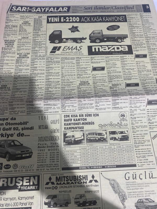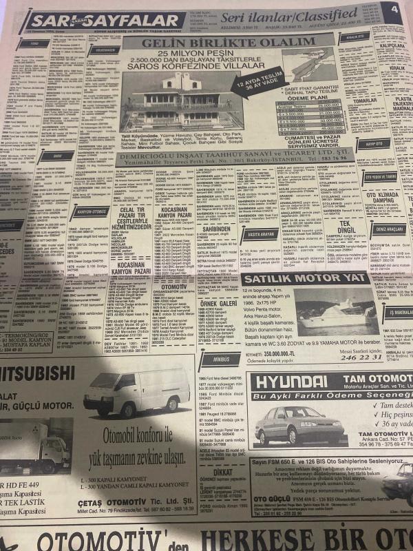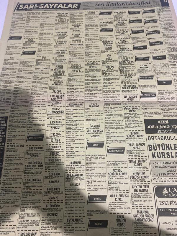 SABAH SARI SAYFALAR SERİ İLANLAR GAZETESİ DOĞUM GÜNÜ HEDİYESİ- 10 TEMMUZ 1992-selvi Tekstil Sanayi-palet limited Şirketi-elma kent villaları-Demircioğlu inşaat-Emin otomotiv-Çetaş otomotiv-ruşen ticaret-kuran otomotiv-Kawasaki-Yavuz oto-Ortaköy otomotiv-en kar A-EA oto-Pamukbank konut destek kredisi-Çarmıklı Yapı-Seren ahşap-lider bilgisayar-Cengiz ticaret- elber AŞ-çapa Sürücü kursu-akademik bilimler merkezi dershanesi-sigorta-garson-mobilya-kuaför-Çocuk bakım-emlakçı-sağlık-tahsilatçı-şoför-temizlik elemanı-tezgahtar-tornacı-kasap-pastane-muhasebe-Beşiktaş-Beykoz-Alibeyköy-Bağcılar-Bakırköy-Gayrettepe-laleli-Levent-Gaziosmanpaşa-Fatih-Beşiktaş-Fındıkzade-Küçükçekmece-Ortaköy-Florya-Fulya- Üsküdar-Göztepe-Bağlarbaşı-Ataşehir-Yalova-Tuzla-Avcılar-Ulus-Merter-Anadoluhisarı-Tarabya-Sefaköy-yakacık-Suadiye-moda-kazasker-Maltepe-Kartal-Kalamış-Kadıköy-bostancı-akatlar Mecidiyeköy-Kocamustafapaşa-Çamlıca-Koşuyolu-Pendik-Kozyatağı-Ford-Mercedes-Citroen-BMW-Mazda-Kartal adlı eser Türkçe dilindedir. Eserin içeriğinde Türkçe dilinde bölümlere de yer verilmektedir.