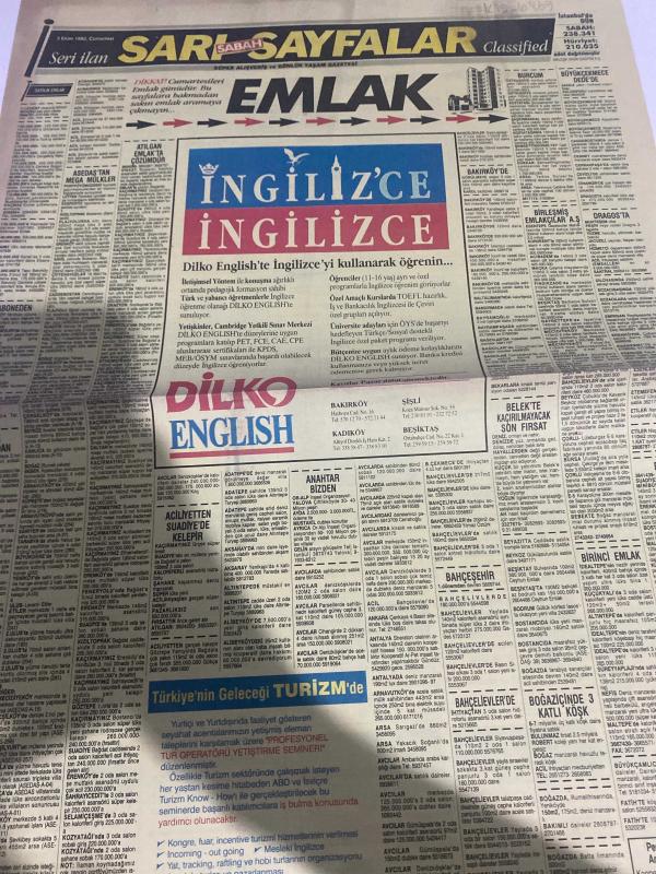 SABAH SARI SAYFALAR SERİ İLANLAR GAZETESİ DOĞUM GÜNÜ HEDİYESİ- 3 EKİM 1992-DİLKO english-ıntercom-kalkan patara konut-ilke emlak-birleşmiş emlakçılar-Gürkan toplu konut organizasyonu-Özdemir inşaat-Mahir emlak-form mobilya-Serko Tekstil-Tarhan plastik Sanayi-alacalı Tekstil-lider Şirketler grubu-Aylin bilgisayar-kervan çeyiz-kent İngilizce-sigorta-garson-mobilya-kuaför-Çocuk bakım-emlakçı-sağlık-tahsilatçı-şoför-temizlik elemanı-tezgahtar-tornacı-kasap-pastane-muhasebe-Beşiktaş-Beykoz-Alibeyköy-Bağcılar-Bakırköy-Gayrettepe-laleli-Levent-Gaziosmanpaşa-Fatih-Beşiktaş-Fındıkzade-Küçükçekmece-Ortaköy-Florya-Fulya- Üsküdar-Göztepe-Bağlarbaşı-Ataşehir-Yalova-Tuzla-Avcılar-Ulus-Merter-Anadoluhisarı-Tarabya-Sefaköy-yakacık-Suadiye-moda-kazasker-Maltepe-Kartal-Kalamış-Kadıköy-bostancı-akatlar Mecidiyeköy-Kocamustafapaşa-Çamlıca-Koşuyolu-Pendik-Kozyatağı-Ford-Mercedes-Citroen-BMW-Mazda-Kartal adlı eser Türkçe dilindedir. Eserin içeriğinde Türkçe dilinde bölümlere de yer verilmektedir.