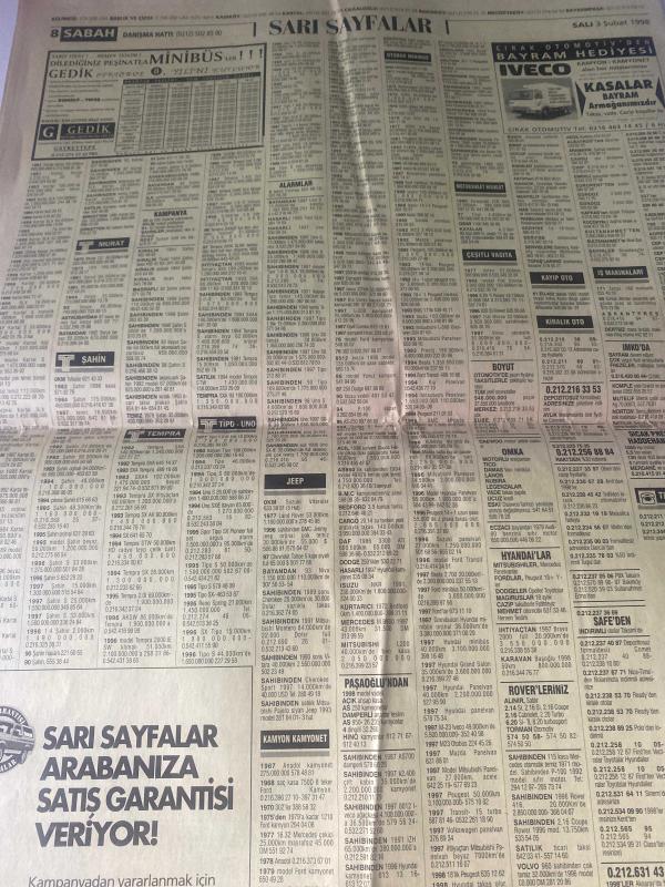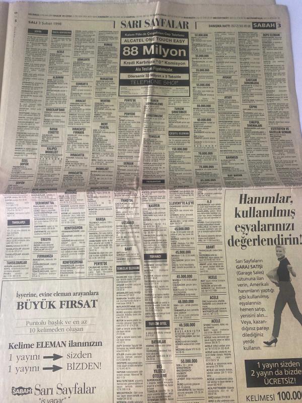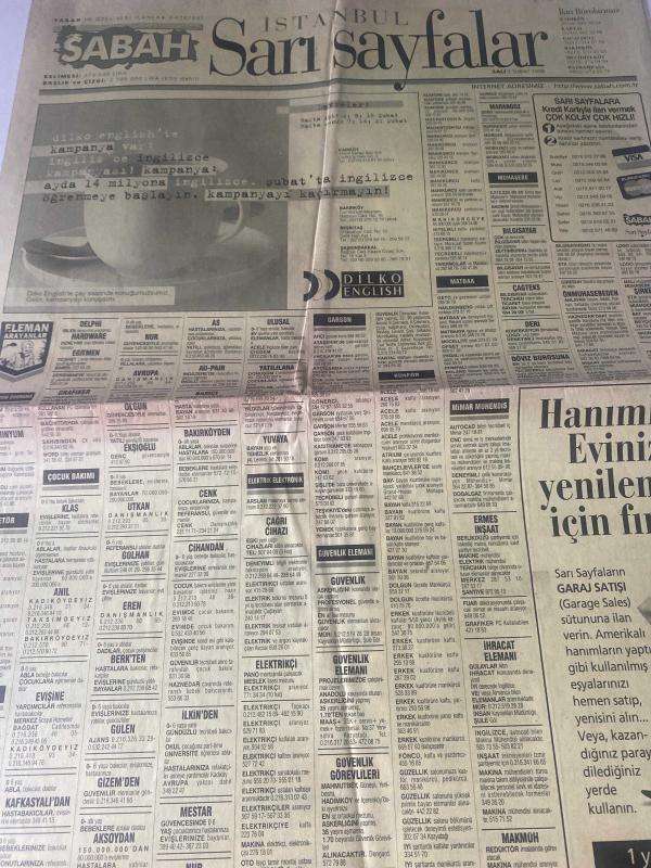SABAH SARI SAYFALAR SERİ İLANLAR GAZETESİ DOĞUM GÜNÜ HEDİYESİ- 3 ŞUBAT 1998-Dilko english-Sarar-abana elektronik-Medi grup-sense tekstil-ulusal klima-modernteks-telephoneshop-İstanbul telekom-Gökçe motorlu araçlar-afrodit aş-gedik motorlu araçlar-sigorta-garson-mobilya-kuaför-Çocuk bakım-emlakçı-sağlık-tahsilatçı-şoför-temizlik elemanı-tezgahtar-tornacı-kasap-pastane-muhasebe-Beşiktaş-Beykoz-Alibeyköy-Bağcılar-Bakırköy-Gayrettepe-laleli-Levent-Gaziosmanpaşa-Fatih-Beşiktaş-Fındıkzade-Küçükçekmece-Ortaköy-Florya-Fulya- Üsküdar-Göztepe-Bağlarbaşı-Ataşehir-Yalova-Tuzla-Avcılar-Ulus-Merter-Anadoluhisarı-Tarabya-Sefaköy-yakacık-Suadiye-moda-kazasker-Maltepe-Kartal-Kalamış-Kadıköy-bostancı-akatlar Mecidiyeköy-Kocamustafapaşa-Çamlıca-Koşuyolu-Pendik-Kozyatağı-Ford-Mercedes-Citroen-BMW adlı eser Türkçe dilindedir. Eserin içeriğinde Türkçe dilinde bölümlere de yer verilmektedir.