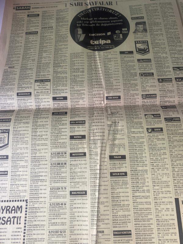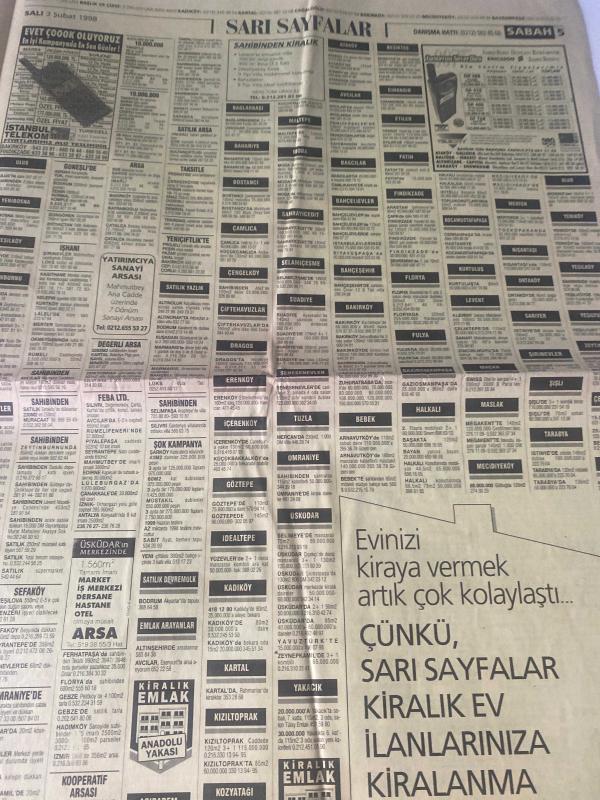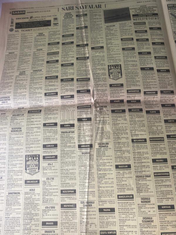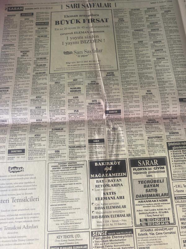 SABAH SARI SAYFALAR SERİ İLANLAR GAZETESİ DOĞUM GÜNÜ HEDİYESİ- 3 ŞUBAT 1998-Dilko english-Sarar-abana elektronik-Medi grup-sense tekstil-ulusal klima-modernteks-telephoneshop-İstanbul telekom-Gökçe motorlu araçlar-afrodit aş-gedik motorlu araçlar-sigorta-garson-mobilya-kuaför-Çocuk bakım-emlakçı-sağlık-tahsilatçı-şoför-temizlik elemanı-tezgahtar-tornacı-kasap-pastane-muhasebe-Beşiktaş-Beykoz-Alibeyköy-Bağcılar-Bakırköy-Gayrettepe-laleli-Levent-Gaziosmanpaşa-Fatih-Beşiktaş-Fındıkzade-Küçükçekmece-Ortaköy-Florya-Fulya- Üsküdar-Göztepe-Bağlarbaşı-Ataşehir-Yalova-Tuzla-Avcılar-Ulus-Merter-Anadoluhisarı-Tarabya-Sefaköy-yakacık-Suadiye-moda-kazasker-Maltepe-Kartal-Kalamış-Kadıköy-bostancı-akatlar Mecidiyeköy-Kocamustafapaşa-Çamlıca-Koşuyolu-Pendik-Kozyatağı-Ford-Mercedes-Citroen-BMW adlı eser, Kitap > Süreli Yayınlar > Gazeteler > Türkiye > Genel > Günlük kategorisinde İkinci El olarak satıştadır.