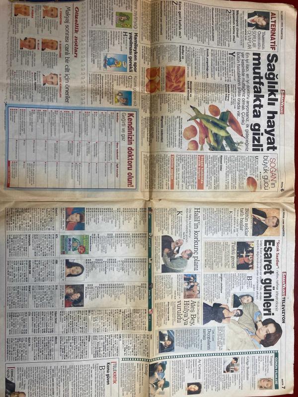 SABAH YILDIZI GAZETESİ DOĞUM GÜNÜ HEDİYESİ - 12 NİSAN 1999 - TAM TAKIM 8 SAYFADIR -Ece Erken - Nigar Akay - Sezen Aksu - Bülent Ersoy - Fatma Adler - Cem Adler - Mesut Ekener - Ebru - Müjdat Akçay - Berk - Oya Aydoğan - Ara Güler - Aylin Coşkun - Yasemin Özmutlu - Hakkı Yalçın - Haldun Dormen - Tamer Karadağlı - Hülya Avşar - Mehmet Ali Erbil - Naomi Campbell - Kevser Hanım - Özlem Derya - Yaşar - Halil Ergün - Fikret Kuşkan - Rüya - Reha Muhtar Soğanın büyük gücü - Atalarımızın mucize besin dediği soğan her derde deva - Kurtlara yem olmayacağım - 1978’den 1999’a Ece Erken - Sezen’in tutkulu kaldığı villa - Efsaneyle gelen güzellik - Aşkınızı nasıl anlarsınız - 4 milyar için küstüler - 5 önemli diyet hatası - Süper Babaanne - Sağlıklı hayat mutfakta gizli - Esaret günleri - Halil’in korkunç planı Hülya’yı vurdu - Bülent Ersoy ile kayınvalidesi Fatma Adler otomobil için birbirlerine girdiler - Aşk Bey Hülya’ya tutuldu - Yorgun aşıklar - Telekritik - Sezen Aksu Yıldız Tilbe’ye karşı - Y adlı eser, Kitap > Süreli Yayınlar > Gazeteler > Türkiye > Genel > Günlük kategorisinde İkinci El olarak satıştadır.