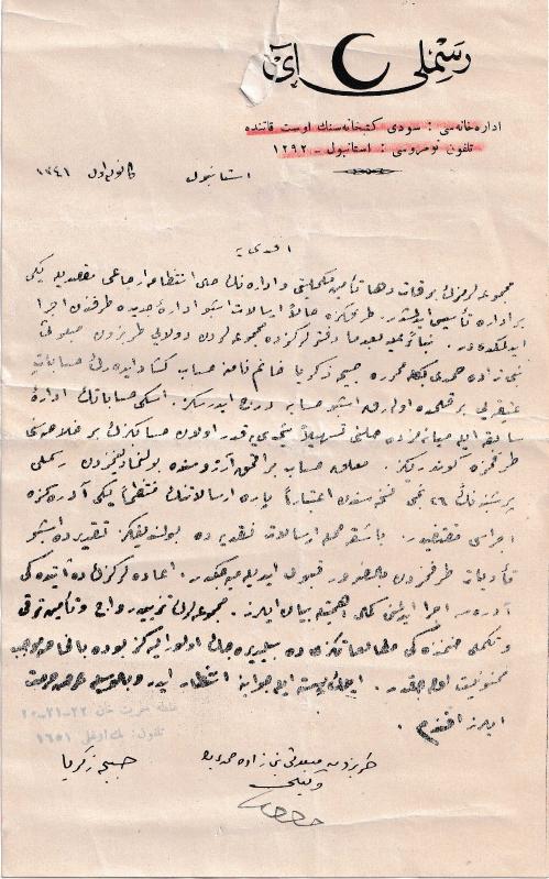 SABİHA ZEKERİYA SERTEL (1890-1980) - Islak imzalı, "Resimli Ay" Mecmuası antetli kağıda tamamı Osmanlıca (metin matbu), ismi zikredilmeyen bir bayiiye mecmuanın “tezyîd-i revâc ve temîn-i terakkî ve tekmîli zımnındaki” bilgileri, eski hesapla ilgili bilgilerin verildiği, matbuat tarihimiz ile ilgili önemli mektup (Trabzon mebusu NEcmizâde Mehmed Bey vekilinden de imzalı) Osmanlıca “Resimli Ay” antetli kağıda, tamamı Osmanlıca metin, 15 satır matbu yazı altında Sabiha Zekeriya Sertel’den ve Trabzon mebusu vekilinden ıslak imzalı. 21,5x14 cm, üst klısımda eksiği bulunmayan küçük bir yırtık mevcut, ortada standard kat izi; haricen son derece iyi korunmuş. “Mecmualarımızın bir kat daha temîn-i mükemmeliyeti ve idarenin mâlî intizâma ircâi’ maksadıyle yeni bir idare temin edilmiştir. Tarafınıza hala irsâlât işbu idare-i cedîde tarafından icrâ edilmektedir. (?) defterlerinizde mecmualardan dolayı Trabzon mebusu Necmizâde Mehmed Beyle muharrîre Sabiha Zekeriya Hanım namına hesâb-ı küşâd ederek hesâbât (?) bir kalemde olarak işbu hesâba derc edersiniz. Eski hesâbâtın idare-yi sabıka ile (?) maliyeti tehîlen şimdiye kadar olan hesâbınızın bir hülâsâsını tarafımıza gönderiniz. Muallâk hesâb bırakmak arzusunda bulunmadığımızdan Resimli Perşembe’nin 26ıncı nüshasından itibâren para irsâlâtının yeni idaremize icrâsı muktefîdir. Başka irsâlât-ı nakdiyede bulunduğunuz takdirde işbu tediyyât tarafımızdan der kabul edilemeyecektir. İadelerinizin de âtîdeki idaremize icrâ edilmesini kemâl-i ehemmiyetle beyân eyleriz. Mecmuaların tezyîd-i revâc ve temîn-i terakkî ve tekmîli zımnındaki muamelâtınızı da bildirecek olur iseniz bu da (?) mûcîb-i memnûniyet olacaktır. İlk posta ile cevâbına intizâr eder ve bilvesîle arz-ı hürmet eyleriz efendim.” Resimli Ay, Sabiha Sertel ve Zekeriya Sertel tarafından çıkarılan aylık edebiyat ve magazin dergisi. 1924 ile 1931 yılları arasında yayımlanmıştır. İlk yıllarında Cumhuriyeti destekleyen, eğitici ve çağdaş bir görünüme sahiptir. Cevat Şakir Kabaağaçlı'nın yazdığı bir makaleden sonra kapatılmıştır. Daha sonra tekrar açılan dergi, Nâzım Hikmet'in de katkılarıyla bazı değişimlere uğramıştır. 1930 yılında ise tekrar kapatılmış, ilerleyen dönemlerde tekrar açma girişimleri olsa da başarılı olunamamıştır. Peyami Safa, Nâzım Hikmet, Sadri Ertem, Suat Derviş, Sabahattin Ali, Emin Türk, Vâlâ Nureddin, Mahmut Yesari, İlhami Bekir, Nizamettin Nazif, Münire Handan ve F. Celalettin gibi yazarlar dergide görev almıştır. Sabiha (önce Ziya, sonra Zekeriya) Sertel, Türk gazeteci ve yazar. İlk Türk kadın gazetecidir. Türkiye'de feminizmin öncüleri arasında sayılır. Sosyalist-komünist görüşlü bir gazeteci-yazardır. Türk basın tarihinde önemli bir isim olan Zekeriya Sertel’in eşidir. 1895 yılında Selanik’te doğdu. Ailesi İspanya'daki Engizisyon zulmünden kaçarak Osmanlı İmparatorluğu'na sığınan Yahudi cemaati içerisinde çıkan ayrılık sonucu resmi olarak Müslümanlığa geçmek zorunda kalan kesimdendi (Sabetayist = Dönme). Selanik'in Yunan işgaline uğraması üzerine 1912 yılında ailesiyle İstanbul’a göçtü. 1915’te gazeteci Mehmet Zekeriya (Sertel) Bey ile evlendi. Sabiha Sertel'in gerek feministliği gerekse sosyalist kişiliği çeşitli sebepler dolayısıyla tartışma konusu olmuştur. 1924-1931 yılları arasında eşiyle beraber Resimli Ay dergisini çıkardı. Makalelerinde işçi sınıfının haklarını savundu, sosyal ve politik düzeni eleştiren yazılar yazdı. Cevat Şakir’in dergide yayımlanan bir yazısı yüzünden eşinin Sinop’ta kalebentliğe mahkûm edilmesi üzerine 3 yıl dergiyi tek başına yönetti. Moskova'dan dönen Nâzım Hikmet'in de yazar kadrosuna girdiği dergide 1930 yılında yayımladığı Savulun Geliyorum başlıklı yazısı nedeniyle mahkemeye sevk edildi ve “neşriyat yüzünden mahkemeye sevk edilen ilk Türk kadını” oldu. 1931 yılında Resimli Ay kapanınca yazı yayımlama olanağından yoksun kaldı ve 1936 yılına kadar çeşitli sosyalist-komünist yayınları tercüme edip yayımlamakla meşgul oldu. 1935 yılında Resimli Her Şey adlı bir haftalık dergi çıkardı. İlk sayısı 28 Eylül 1935’te çıkan derginin yazı kadrosunda Nâzım Hikmet ve arkadaşları yer alıyordu. Bu derginin kapatılmasının ardından 1936 yılının Mart ayında Projektör adlı aylık bir fikir dergisi çıkardı. Dergi ilk sayısında kapatıldı.