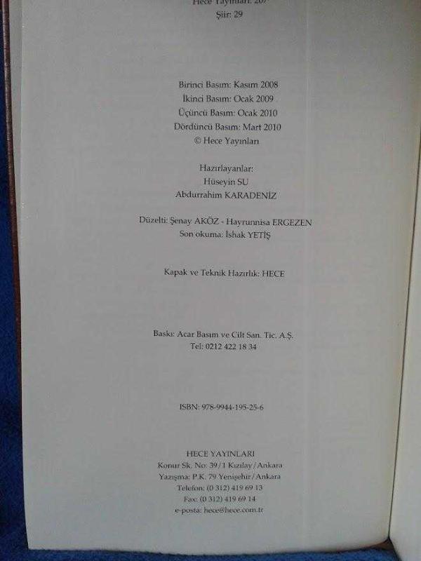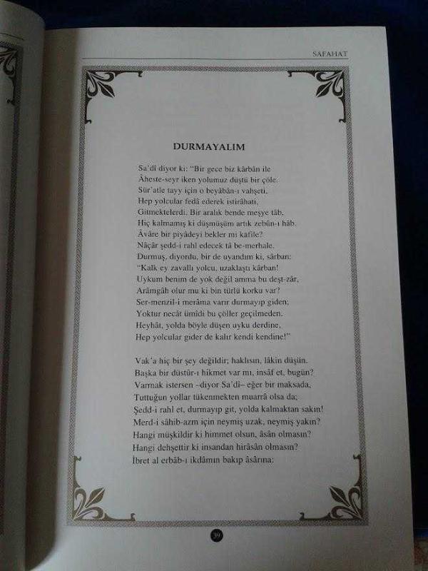 SAFAHAT, ÖZEL BASKI, CİLTLİ, SINIRLI BASKI. Baskısı tükenmiş , özel sınırlı baskı , deri ciltli (Tekstil bazlı suni deri.) kalın kapaklı cildin sırt kısmında ve uçlarında malisef yer yer döküntüler vardır. Yaprakları gayet temiz , kenarları altın yaldız boyalı ve eksiksizdir. Yazar: Mehmet Akif Ersoy YayınEvi: Hece Yayınları Yayın Teri. Ankara Sayfa: 528 Çekimden kaynaklı renk farkı oluşmaktadır.