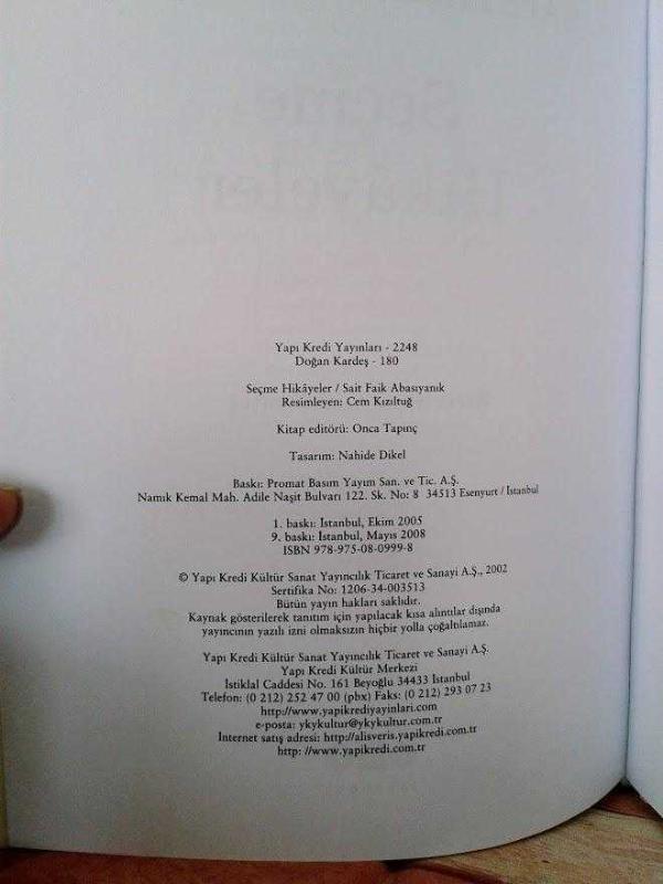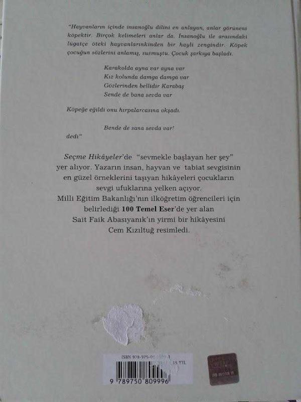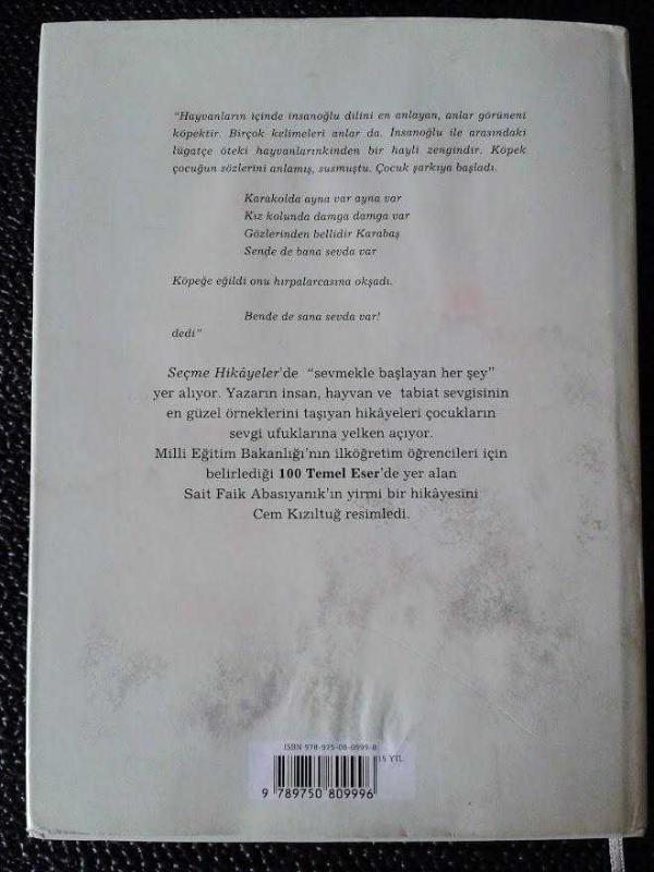 SAİT FAİK ABASIYANIK - SEÇME HİKÂYELER Seçme Hikâyeler'de "sevmekle başlayan her şey" yer alıyor. Yazarın insan, hayvan ve tabiat sevgisinin en güzel örneklerini taşıyan hikâyeleri çocukların sevgi ufuklarına yelken açıyor. Milli Eğitim Bakanlığı'nın ilköğretim öğrencileri için belirlediği 100 Temel Eser'de yer alan Sait Faik Abasıyanık'ın yirmi bir hikâyesini Cem Kızıltuğ resimledi. " Sait Faik Abasıyanık (1906-1954), Türk hikâye ve roman yazarı, şair. Türk hikâyeciliğinin önde gelen yazarlarından birisi olan Sait Faik, çağdaş hikâyeciliğe yaptığı katkılar nedeniyle Türk edebiyatının köşe taşlarından biri olarak kabul edilir." Yapı Kredi Yayınları, Doğan Kardeş. Yayın Tarihi: 2008 / 9 ISBN: 9789750809996 Dil: TÜRKÇE Sayfa Sayısı: 127 Cilt Tipi: Sömizli -Ciltli Şömizde lekeler ve arka iç kısmında küçük bir yapışmadan kaynaklı yırtık mevcut. Resimlerde gözükmekte. Sayfaları çok temiz ve eksiksiz. Çekimden kaynaklı renk farkı oluşmaktadır.