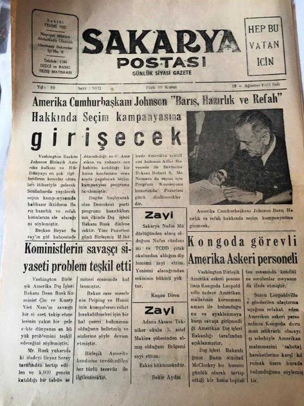 SAKARYA POSTASI SİYASİ GAZETE YEREL TAŞRA BASINI : 18 Ağustos 1964- YIL :10 SAYI :5032- Amerika Cumhurbaşkanı Johnson " Barış Hazırlık Ve Refah " Hakkında Seçim Kampanyasına Girişecek - Komünistlerin savaşçı siyaseti problem teşkil etti - Zayi Kenan Diren -Zayi Bekir Aydın - İlan Tarifesi - Yıpranma, sararmalar, kupon kesiği ve yırtılmalar zamana bağlı olarak görülebilir.