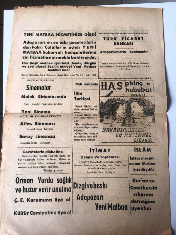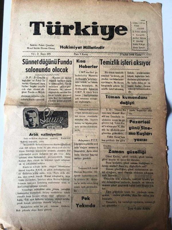 SAKARYA TÜRKİYE GAZETESİ YEREL TAŞRA BASINI - 5 Eylül 1958 YIL :3 SAYI 695- Sünnet düğünü funda salonunda olacak Fahri Çatallar - Temizlik İşleri Aksıyor - Tümen kumandanı değişti - Zaman Güzelliği Ziya Vehbi Altürk - Sinemalar Melek Sineması Katil peşinde , Yeni Sinema Güzel Helen , İman Kuvveti - Atlas Sineması Cennet Kuşu Kovadis - Saray Sineması Enayiler Kralı - İlan Tarifesi Yıpranma, sararmalar, kupon kesiği ve yırtılmalar zamana bağlı olarak görülebilir.