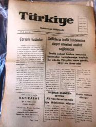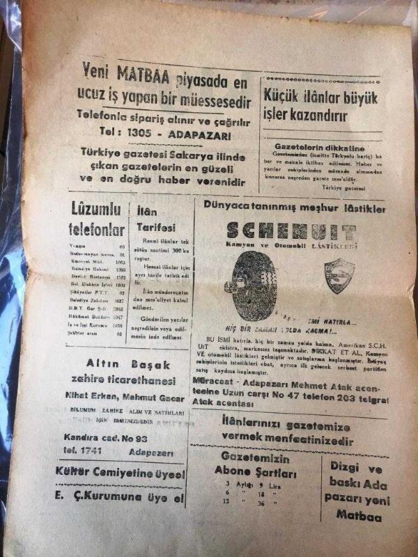 SAKARYA TÜRKİYE Gazetesi -Hakimiyet milletindir - Yerel Taşra Basını - 8 TEMMUZ 1959- YIL :3 SAYI :949-Çarşaflı Kadınlar-Şoförlerin trafik kaidelerine riayet etmeleri mutlak sağlanacak -Meşhur Manken Bettina ALİ Han İle evlenmek için müslüman oluyor-Emlak fiyatları düşüyor-- -Lüzumlu Telefonlar-İlan Tarifesi Küçük ilanlar büyük işler kazandırıyor -Dünyaca tanınmış meşhur lastikler SCHENUIT kamyon ve otomobil Lastikleri Yıpranma, sararmalar, kupon kesiği ve yırtılmalar zamana bağlı olarak görülebilir.