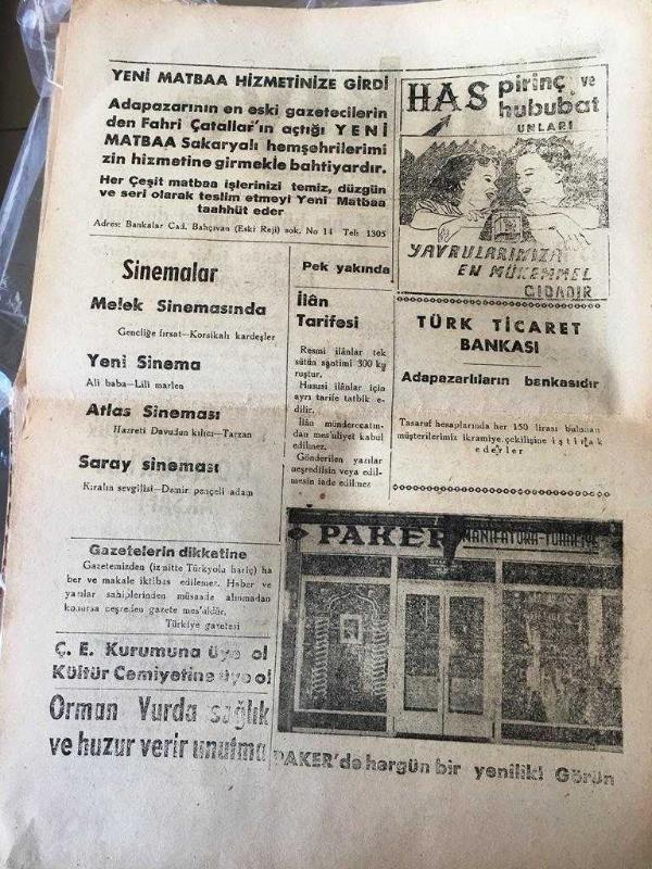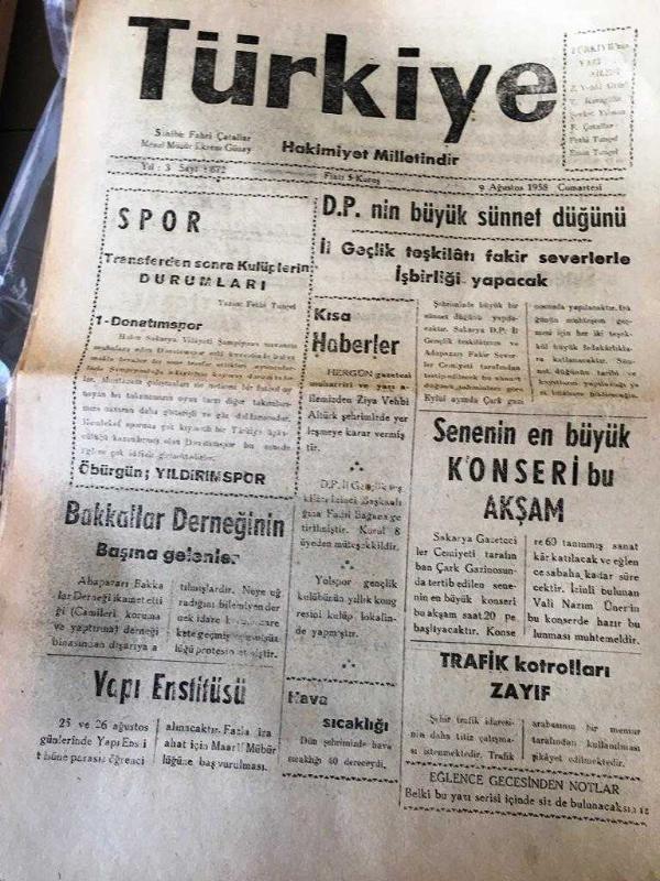 SAKARYA TÜRKİYE Gazetesi -Hakimiyet milletindir - Yerel Taşra Basını - 9 Ağustos 1958-YIL :3 SAYI :672- SPOR -BAKKALLAR DERNEĞİNİN Başına Gelenler--Yapı ENSTİRÜSÜ -D.P 'NİN Büyük Sünnet düğünü il Gençlik Teşkilatı Fakir Severlerle işbirliği yapacak -Kısa Haberler - Senenin en büyük konseri bu akşam -Trafik Kontrolleri zayıf--- -Sinemalar -Melek sineması -Yeni sineması - atlas sinema -saray sinema-- Adapazarı'nın en eski gazetecilerin den Yeni matbaa Fahri Çatallar açtığı yeni matbaa Sakaryalı hemşehrilerimizin hizmetinde- İLAN Tarifesi -HAS pirinç ve Hububat unları -Paker --Türk Ticaret Bankasıdır Adapazarlıların bankasıdır - Yıpranma, sararmalar, kupon kesiği ve yırtılmalar zamana bağlı olarak görülebilir.