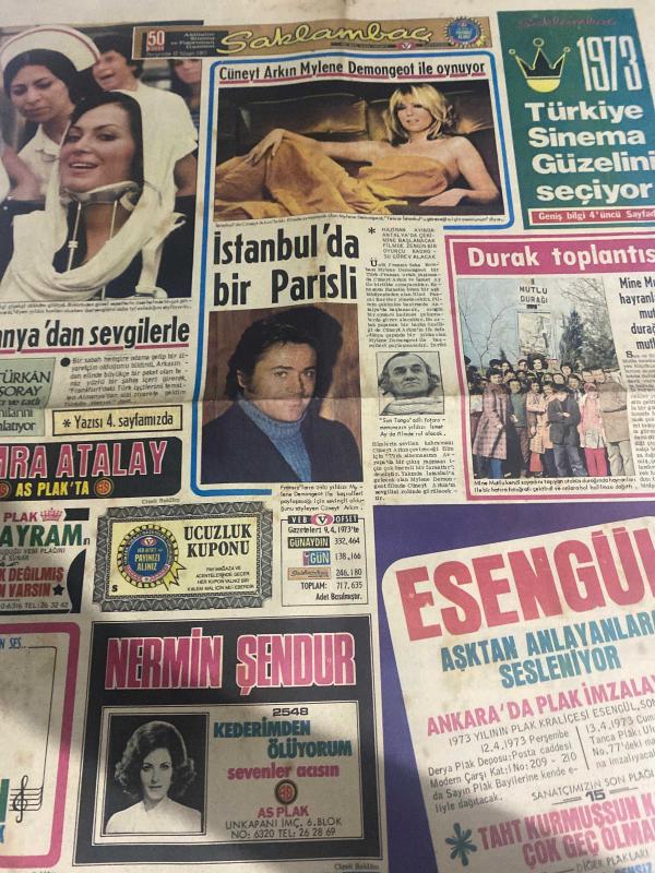 SAKLAMBAÇ TV GAZETESİ DOĞUM GÜNÜ GAZETESİ - 12 NİSAN 1973 - Nermin Şendur-Şükran Ay-hey dost-hekimoğlu-Türkan Şoray-Cüneyt Arkın-son Tango adlı fotografımızın yıldızı İsmet Ay-Mylene Demongeot-Almanya’dan sevgilerle-Türkan Şoray-1973 Türkiye Sinema güzelini seçiyor-son tango-Hülya akar-okyay ok-güzin abla-Tarık ak-yıldız falı-bulmaca adlı eser Türkçe dilindedir.