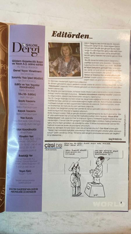 ŞALOM DERGİSİ - NİSAN 2013 SAYI: 21 GÜNDÜZ VASSAF - SEZEN AKSU - CORRY GUTTSTADT - ÖZCAN KÖKNEL - SUNA KESKİN - EROL KESKİN - MARIE CURIE - OTTO CURIE - GWYNETH PALTROW - JUSTIN BIEBER - DANIEL RADCLIFFE - JACOB BERNSTEIN - NORA EPHRON - ADAM SANDLER - KEVIN JAMES - CHRIS ROCK - DENNIS DUGAN - IRVIN MANDEL - NELLY BAROKAS - YAKUP BAROKAS - IVO MOLINAS - IŞIK SİVİL KARAKOÇ - İSAK BEHAR - SEMRA ÖNER - BELLA PARLAKŞİMŞEK - GILA ERBEŞ - TUNA SAYLAĞ - AYLİN YENGİN - ANET PASE AZ-ICIK DAHA KÖPRÜ İLE YAŞAMAK - VAHŞİ ÂLEM KENYA’DA MASAİ KABİLESİ - ŞİMDİ BAHAR ZAMANI - NOBEL AİLESİ MARIE CURIE - İTALYAN SİNEMASINDA ROMA AÇIK ŞEHİR - PEOPLE’A GÖRE DÜNYANIN EN GÜZEL KADINI - MAYIS 68’DE CANNES SERÜVENİ - GÜNIŞIĞINA KAFKA İLE BAKMAK - DOLU DOLU YAŞAMAK - HOLLYWOOD’DA EVERYTHING IS COPY - KÖLELER İMPARATORLUĞU - 32. İSTANBUL FİLM FESTİVALİ - SAHNELERİMİZDE NELER OLUYOR - KÖŞELİ ANLATIMLAR - DİSKOLAYALIM - İTALYAN SİNEMASI - GROWN UPS 2 - DANIEL RADCLIFFE YÖNETMEN O - TAM TAKIM EKSİKSİZ 134 SAYFA adlı eser, Kitap > Süreli Yayınlar > Dergiler > Magazin, Moda kategorisinde İkinci El olarak satıştadır.