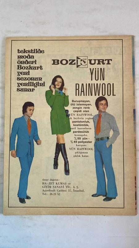 SAMANYOLU ELBİSE PATRON İLAVELİ MECMUA DERGİ - 21 HAZİRAN 1973 – SAYI: 77 TÜRKAN ŞORAY – AJDA PEKKAN – UĞUR DÜNDAR – LEYLA SAYAR – ERTAÇ KASİDECİOĞLU – TANJU OKAN – ESİN AFŞAR – NİLÜFER – MINA – TIMUR SELÇUK – SEVİL HASMAN – VURAL CANTÜRK – BARIŞ MANÇO – GEORGE – FRED – PAT – MİLENA PLAJ MODASI: MAVİ-BEYAZ BİKİNİ VE MAYO – ÇİÇEKLİ BİKİNİLER – KEMERLİ MAYO TASARIMLARI – YAZLIK AKSESUARLAR ROMAN: “ÖLÜM TUZAĞI” – GEORGE’UN TUZAĞI – FRED’İN ŞOKU – SİGORTA GERİLİMİ – POLİÇE VADESİ VE KİMLİK DEĞİŞİMİ SİNEMA: TÜRKAN ŞORAY’IN TV PROGRAMI – LEYLA SAYAR’IN GİZLİ EVLİLİĞİ – HÜLYA KOÇYİĞİT & TARIK AKAN FİLM HAZIRLIĞI – AJDA PEKKAN’IN PARİS MÜZİK KARİYERİ – GÜLGÜN ERDEM’İN BEBEK KOLEKSİYONU MÜZİK: AJDA PEKKAN & UĞUR DÜNDAR AŞKI – ESİN AFŞAR’IN İLK PLAKLARI – NİLÜFER’İN YÜKSELİŞİ – EUROVISION ŞARKI HAZIRLIĞI – TIMUR SELÇUK’UN LP PROJESİ – SEVİL HASMAN’IN YENİ DÖNEMİ – BARIŞ MANÇO İLE ANADOLU TURNESİ - 36 SAYFA adlı eser, Kitap > Süreli Yayınlar > Dergiler > Magazin, Moda kategorisinde İkinci El olarak satıştadır.