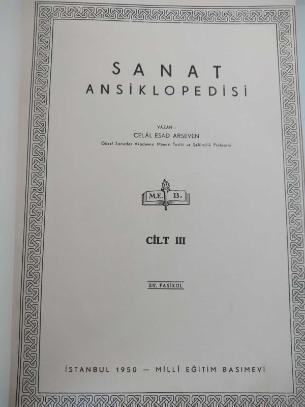 hafif zaman isi, kapak uçlarında yıpranma - iyi sayfa cildi - Yeni gibi Cilt 3 :1185-1664 arası sayfa, (1950) Celal Esad Arseven'in "Sanat Ansiklopedisi" başlıklı 5 ciltlik temel eseri, 1943-1953 arasında yayınlanmıştır. 5. cilt ansiklopedinin ilâve kısmı olup, Fransızca'dan Türkçeye indeks de bu ciltte yer almaktadır. 1. cilt: A-FİSK. _ 2. cilt: FİSK-KÜB. _ 3. cilt: KÜB-RES. _ 4. cilt: RES-Z. .. 5. cilt: İlâve kısm https://kutuphane.ttk.gov.tr/details?id=521216&materialType=KT&query=Arseven%2C+Cel%C3%A2l+Esad+1876-1971 https://dergipark.org.tr/tr/download/article-file/2639016 “Celâl Esat Arseven, Güzel Sanatlar Akademisi Mimari Tarihi ve Şehircilik Profesörü. 5 ciltlik Ansiklopedi önsözünde :” sanat sahasında kalkınmamız için en evvel sanat ıstılahlarını tespit etmek lüzumuna kanaat " getirdiğini belirten Arseven, sanat ve mimari terimlerini yabancı dillerden almamn doğru olmadığına ısrarla işaret ediyordu. Bu büyük ansiklopedide, yalnız sanat terimleri değil, fakat belirli sanat ve arkeoloji konuları müessese ve kazıları üzerinde de durularak, bazen bunlar hakkında küçük makaleler ölçüsünde, içinde o madde ile Türklerin ilgisine de işaret eden maddeler yazılmıştır. Yazdığı kendi başına kitap hacminde madde örnek;‘MİMARİ’ maddesi 60 sayfa (s.1350-1410). Ansiklopedi madde yazımına katkı veren yazarlar, madde başında ayrıca belirtilmiştir. ‘Kütüphane (Adnan Ötüken) s. 1201-1209 ; Mitoloji-Türklerde (H. Namık Orkun) s. 1447-1449; Müzeler —Türkiye'de (Aziz Ogan) s. 1487-1490; Türk ve İslâm Eserleri Müzesi, (Elif Naci) s. 1490-1491; Resim ve Heykel Müzesi (Halil Dikmen) s. 1491- 1493; Topkapı Sarayı Müzesi (Tahsin Öz) s. 1493-1494;..’