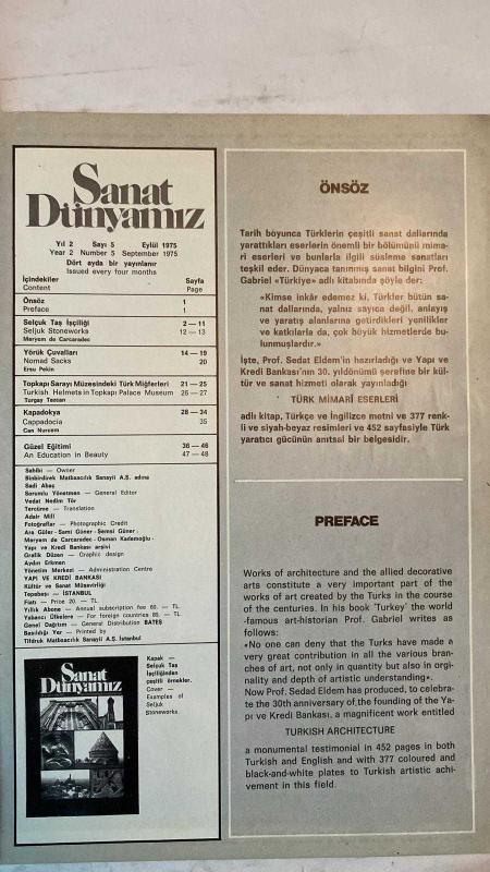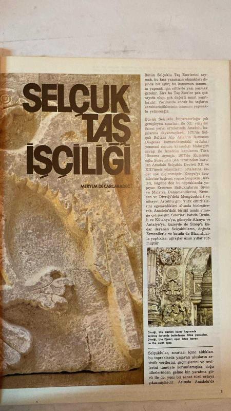 SANAT DÜNYAMIZ, YAPI VE KREDİ BANKASININ BİR KÜLTÜR HİZMETİ DERGİSİ - EYLÜL 1975 SAYI: 5 - SELÇUK TAŞ İŞÇİLİĞİ - YÖRÜK ÇUVALLARI - TOPKAPI SARAYI MÜZESİNDEKİ TÜRK MİĞFERLERİ - KAPADOKYA - TÜRK MİMARİ ESERLERİ - GÜZEL EĞİTİMİ MERYEM DE CARCARADEC - ERSU PEKİN - TURGAY TEZCAN - CAN NURCEM - GABRIEL - SEDAT ELDEM - SADİ ABAÇ - VEDAT NEDİM TÖR - ADAIR MILL - ARA GÜLER - SAMİ GÜNER - ŞEMSİ GÜNER - OSMAN KADEMOĞLU - AYDIN ERKMEN - ALP ASLAN - ROMANOS DIOGENES - SÜLEYMAN ŞAH - TAM TAKIM EKSİKSİZ 48 SAYFA, PROPRİETOR tarafından kaleme alınmıştır. Eser VEDAT NEDİM TÖR editörlüğünde hazırlanmıştır. Kitap TİFDRUK MATBAACILIK SANAYİ tarafından yayınlanmıştır. 48 sayfadır. SANAT DÜNYAMIZ, YAPI VE KREDİ BANKASININ BİR KÜLTÜR HİZMETİ DERGİSİ - EYLÜL 1975 SAYI: 5 - SELÇUK TAŞ İŞÇİLİĞİ - YÖRÜK ÇUVALLARI - TOPKAPI SARAYI MÜZESİNDEKİ TÜRK MİĞFERLERİ - KAPADOKYA - TÜRK MİMARİ ESERLERİ - GÜZEL EĞİTİMİ MERYEM DE CARCARADEC - ERSU PEKİN - TURGAY TEZCAN - CAN NURCEM - GABRIEL - SEDAT ELDEM - SADİ ABAÇ - VEDAT NEDİM TÖR - ADAIR MILL - ARA GÜLER - SAMİ GÜNER - ŞEMSİ GÜNER - OSMAN KADEMOĞLU - AYDIN ERKMEN - ALP ASLAN - ROMANOS DIOGENES - SÜLEYMAN ŞAH - TAM TAKIM EKSİKSİZ 48 SAYFA adlı eser Türkçe dilindedir.
