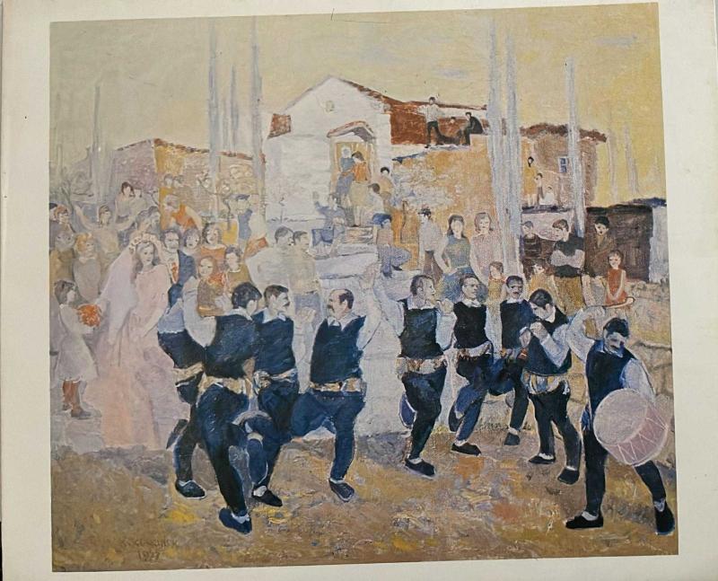 SANAT KARTPOSTALI-KAYHAN KESKİNOK TARAFINDAN ÇİZİLMİŞ DÜĞÜN RESMİ,İÇ KISMINA YAZILMAMIŞ,KAPAKLI,RENKLİ, 13 X 17 CM EBADINDA