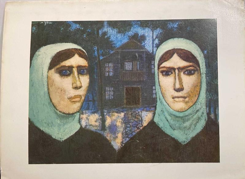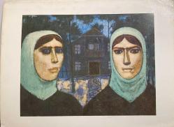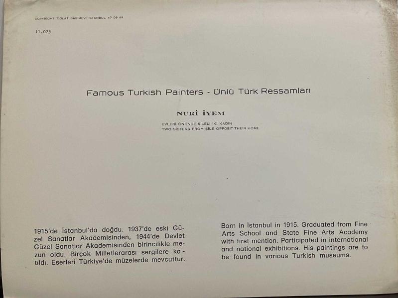 SANAT KARTPOSTALI-NURİ İYEM TARAFINDAN ÇİZİLMİŞ EVLERİ ÖNÜNDE DURAN ŞİLELİ İKİ KADIN RESMİ,İÇ KISMINA YAZILMAMIŞ,KAPAKLI,RENKLİ, 13 X 17 CM EBADINDA, en son 8 ay önce güncellenmiştir.