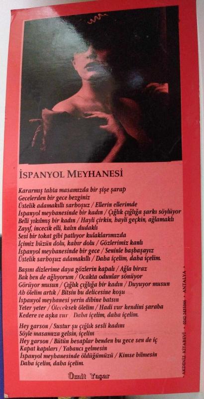 SANAT KARTPOSTALI-ÜMİT YAŞAR'IN YAZMIŞ OLDUĞU İSPANYOL MEYHANESİ ŞİİRİ,ARKASINA YAZILMAMIŞ,RENKLİ, 10 X 20 CM EBADINDA, en son 8 ay önce güncellenmiştir.