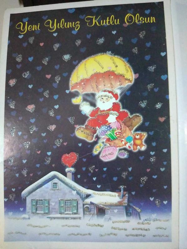 SANAT KARTPOSTALI-ÜSTÜNDE ''YENİ YILINIZ KUTLU OLSUN'' YAZAN PARAŞÜTLE İNEN NOEL BABA RESMİ,ARKASINA YAZILMAMIŞ,RENKLİ,12 X 17 CM EBADINDA, 1 yıl önce satışa sunulmuştur.