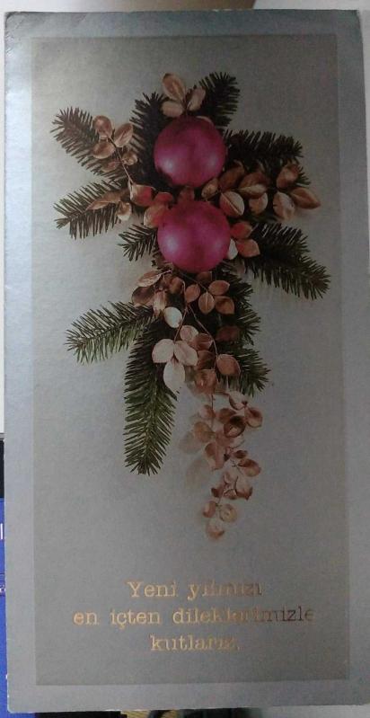 SANAT KARTPOSTALI-ÜSTÜNDE ''YENİ YILINIZI EN İÇTEN DİLEKLERİMİZLE KUTLARIZ'' YAZAN ÇAM AĞACI SÜSLERİ RESMİ,KAPAKLI,İÇ KISMINA YAZILMIŞ,RENKLİ, 10 X 20 CM EBADINDA, en son 8 ay önce güncellenmiştir.