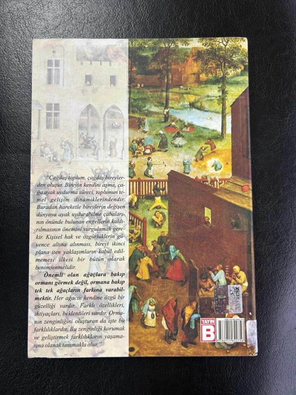 Çağdaş toplum çağdaş bireylerden oluşur. Bireyin kendini aşma, çağa ayak uydurma süreci toplumun temel gelişim dinamiklerindendir. Buradan hareketle bireylerin değişen dünyaya ayak uydurabilme çabalarının önünde bulunan engellerin kaldırılmasının önemini vurgulamak gerekir. Kişisel hak ve özgürlüklerin güvence altına alınması, bireyi ikinci plana iten yaklaşımların kabul edilmemesi ilkesi bir bütün olarak benimsenmelidir. Önemli olan ağaçlara bakıp ormanı görmek değil, ormana bakıp tek tek ağaçların farkına varabilmektir. Her ağacın kendine özgü bir güzelliği vardır. Ormanın zenginliğini oluşturan da işte bu farklılıklardır. Bu zenginliği korumak ve geliştirmek farklılıkların yaşamasına olanak tanımakla olur. Bazı sayfalarda satırların altı kurşun kalem ile çizilmiş. #sanattarihi #sanat #insan #çağlarerbek #yayınb
