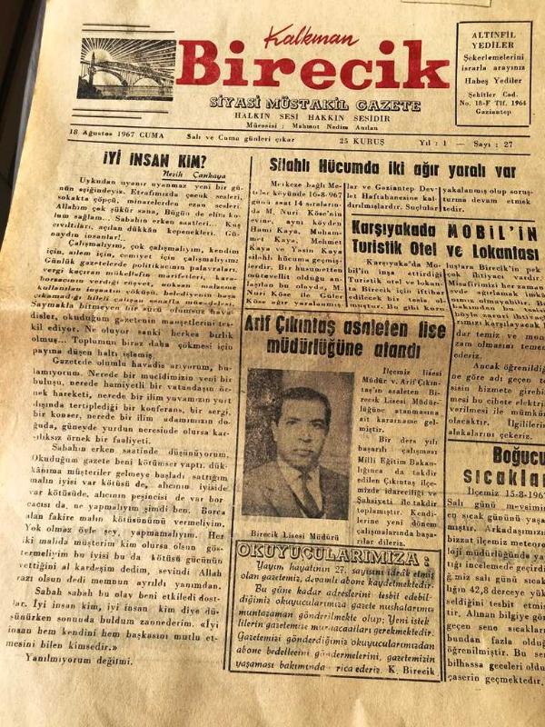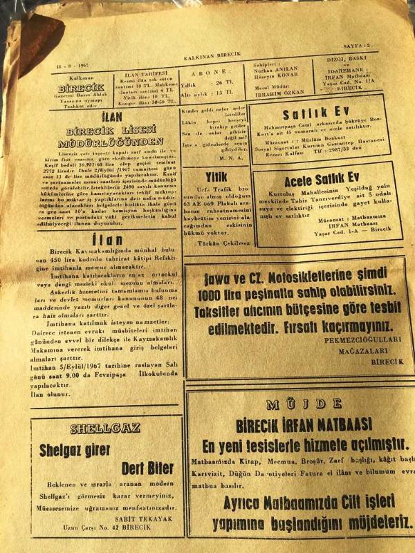 ŞANLI URFA - BİRECİK - HAFTALIK SİYASİ MÜSTAKİL GAZETE HALKIN SESİ HAKKIN SESİDİR - YEREL TAŞRA BASINI - 15 AĞUSTOS 1967-YIL :1 -SAYI :26-İLGİLİLERE SESLENİYORUZ -Huzurumuz ihlal ediliyor -H. Verdi Kankılıç-Belediye Reisi 'nin kontrolü dört kasap cezalandırıldı-Bir hindi için cinayet -Son maaş üzerinden emeklilik kabul edildi -Mersin 'de koyun etinin kilosu 9 liraya indi -Jandarmaya rüşvet vermek istedi-İLAN Birecik lisesi MÜDÜRLÜĞÜNDEN -Son Maaş üzerinden EMEKLİLİK kabul edildi -YİTİK - Yıpranma, sararmalar, kupon kesiği ve yırtılmalar zamana bağlı olarak görülebilir.