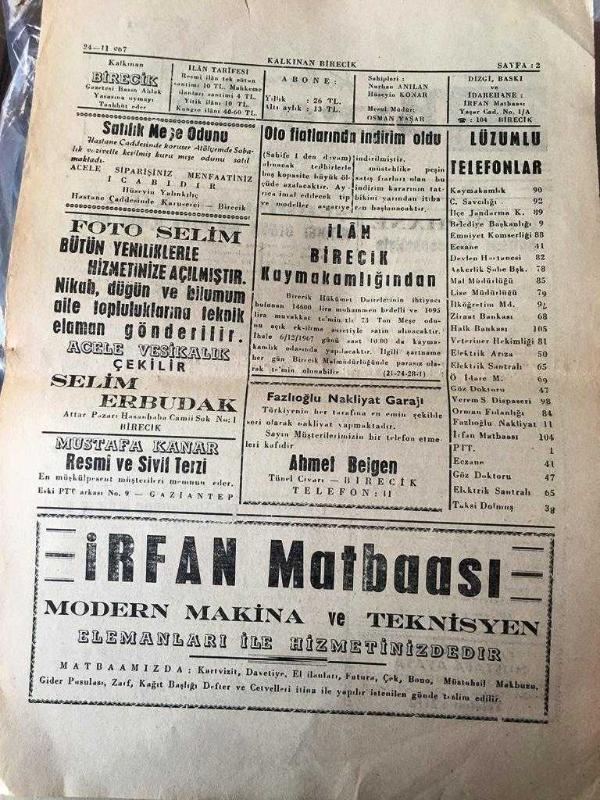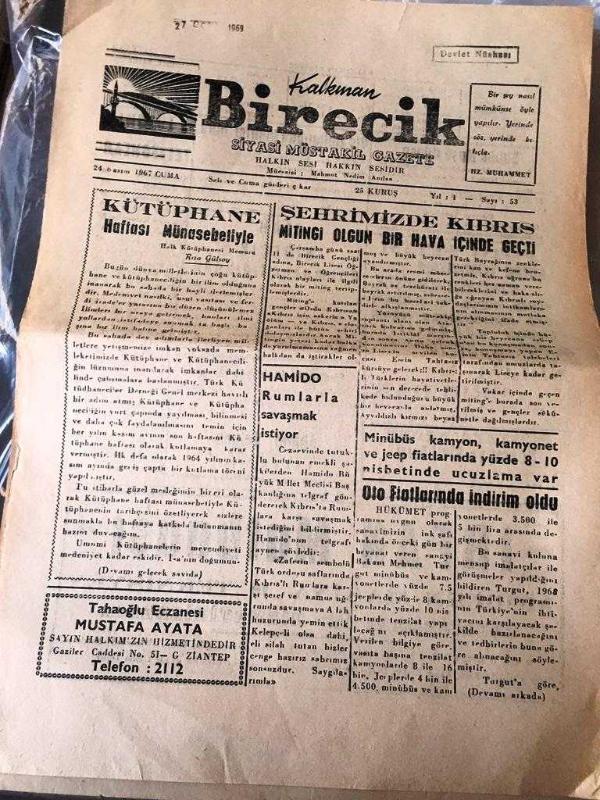 ŞANLI URFA - BİRECİK - HAFTALIK SİYASİ MÜSTAKİL GAZETE HALKIN SESİ HAKKIN SESİDİR - YEREL TAŞRA BASINI - 24 KASIM 1967 -YIL :1 SAYI :53-KÜTÜPHANE HAFTASI MÜNASEBETİYLE - RIZA GÜLSOY -Şehrimizde Kıbrıs Mitingi Olgun Bir Hava İçinde Geçti -Hamido Rumlarla savaşmak istiyor -Tahaoğlu Eczanesi Mustafa Ayata - Oto Fiyatlarında indirim oldu -İlan Birecik Kaymakamlığından lüzumlu telefonlar Yıpranma, sararmalar, kupon kesiği ve yırtılmalar zamana bağlı olarak görülebilir.