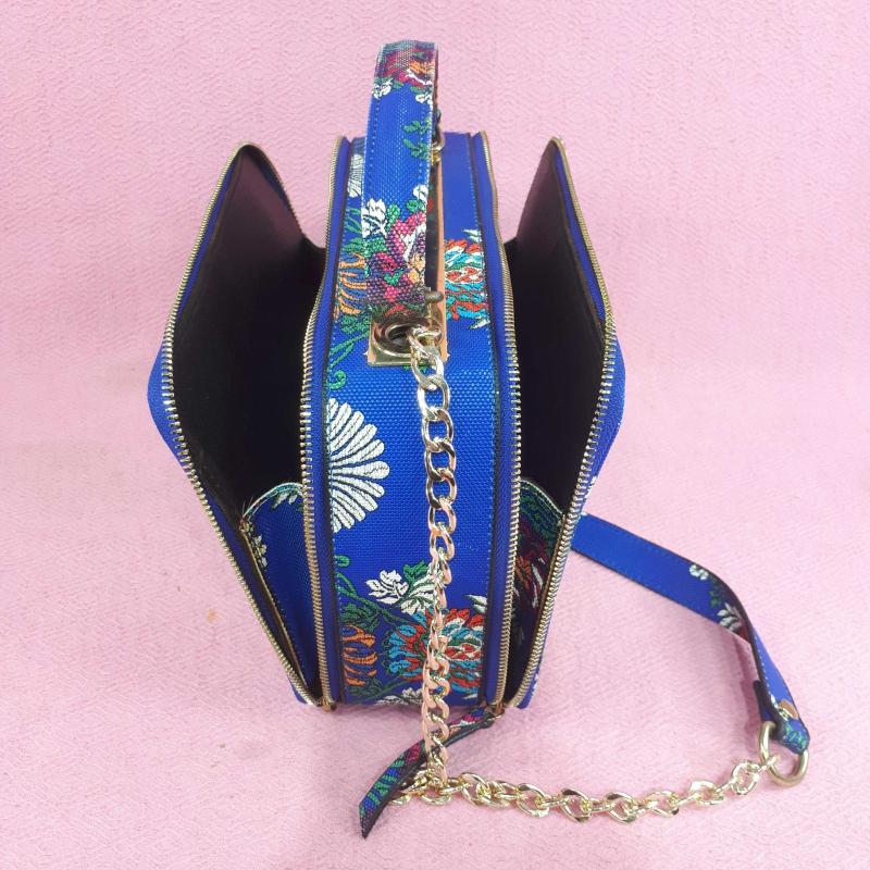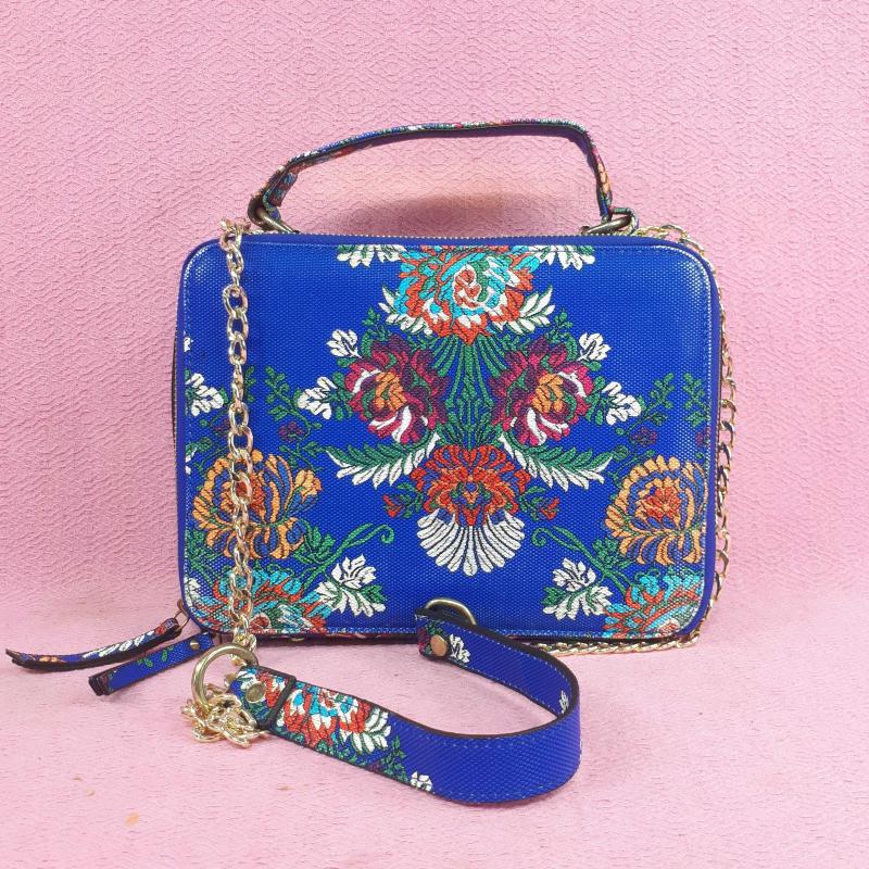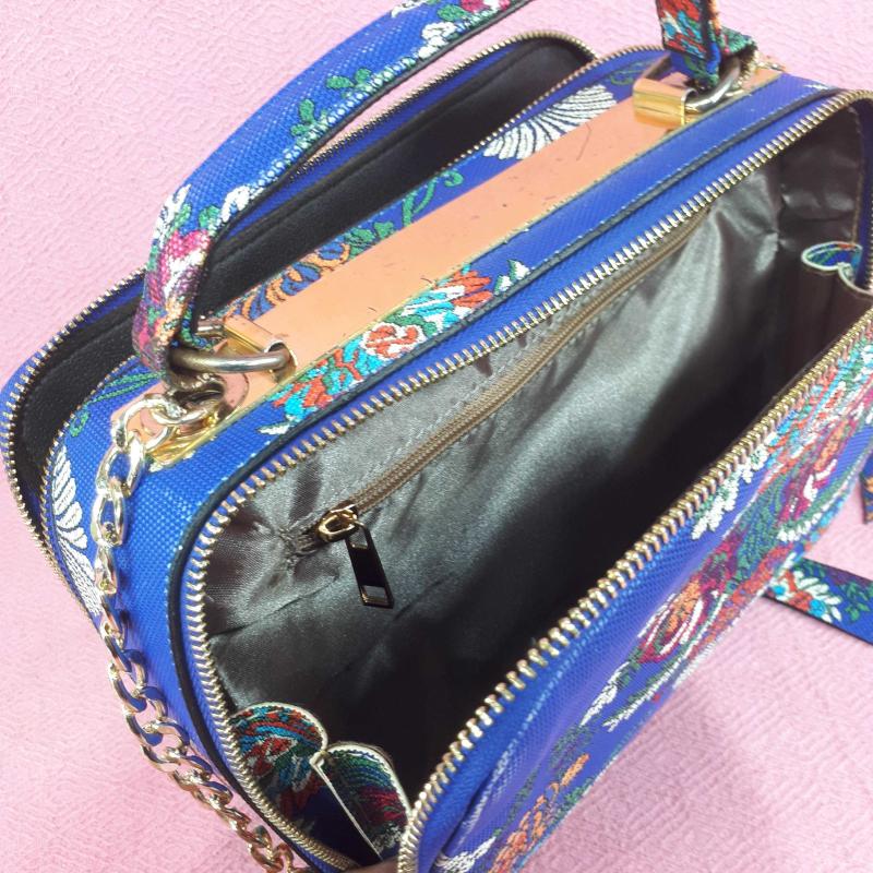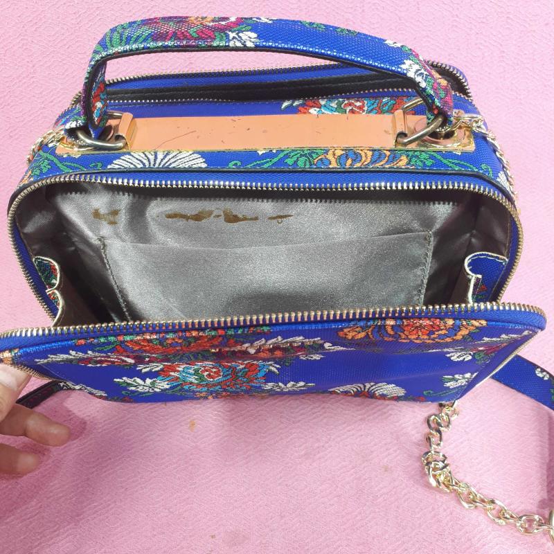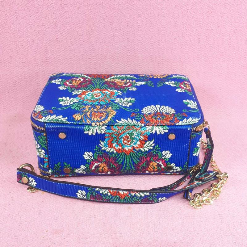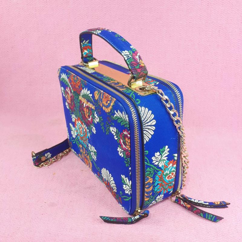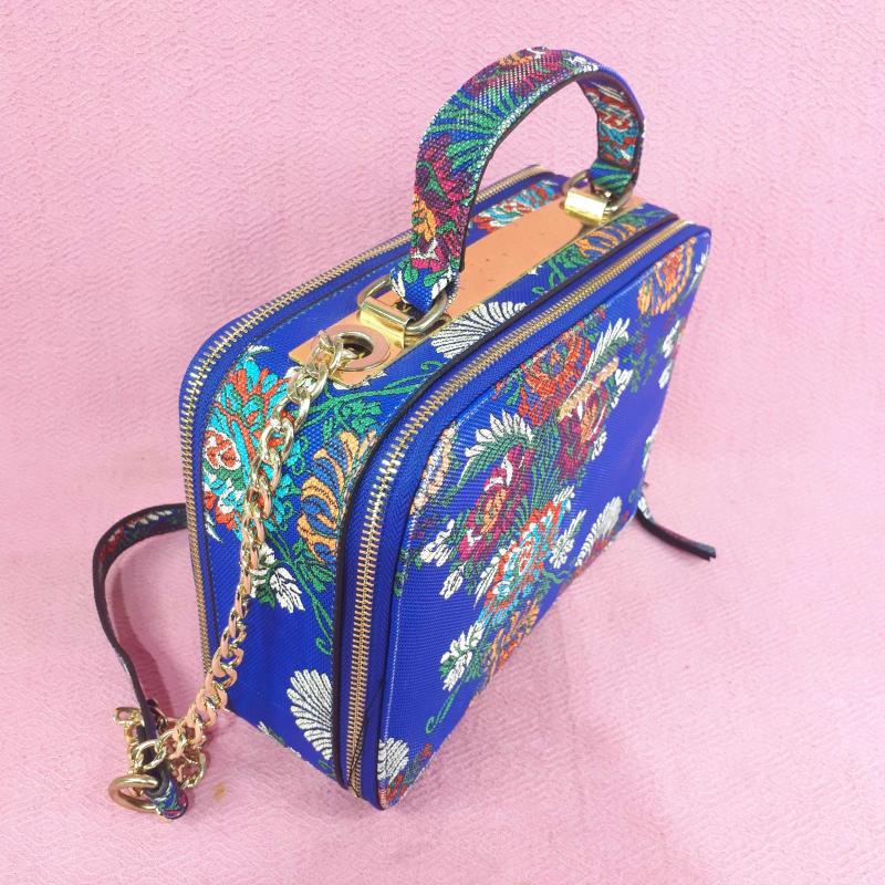 25 x 20 (KULP HARİÇ) x 9,5 cm MAVİ RENKLİ ZEMİN ÜZERİNE MUHTELİF RENKLERDE ÇİÇEKLER DESENLİ KUMAŞ GÖRÜNÜMLÜ SENTETİK MALZEME . FERMUARLAR SAĞLAM . DIŞ MATERYAL VE İÇ ASTAR TEMİZ .