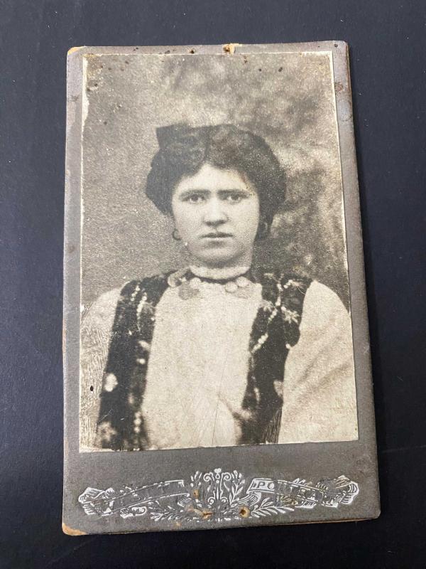 Saray fotoğrafçısının objektifinden KOLEKSİYONLUK portre. 19. yüzyılın sonu ile 20. yüzyılın başı (yaklaşık 1890-1915 arası) dönemine ait klasik bir kabin kartı formatındaki stüdyo portresi. . Fotoğrafın arkasındaki mühür, Avusturya-Macaristan İmparatorluğu’nun kraliyet armasıdır. Fotoğrafçının “İmparatorluk ve Kraliyet Saray Tedarikçisi” (K.u.K. Hofphotograph) unvanına sahip olduğunu veya fotoğrafın o dönemki Avusturya-Macaristan topraklarında (Viyana, Budapeşte, Prag veya o dönem imparatorluğa bağlı olan Balkan toprakları) çekildiğini anlıyoruz. Hanımefendinin üzerindeki işlemeli yelek ve boynundaki takılar, dönemin yerel halk kıyafetleri (folklorik unsurlar) ile şehir modasının karışımı gibi görünüyor. Bu tarz, özellikle Doğu Avrupa ve Balkanlar’da o dönem çok yaygındı. . Saçların yukarıda toplanması ve kullanılan aksesuarlar 1900’lerin başındaki “Belle Époque” dönemine işaret ediyor. . Kartın alt kısmındaki süslemeli şeritte “PORTRAIT” yazısı seçiliyor. Bu, fotoğraf stüdyosunun standart baskı kartonu kullandığını gösterir. Sol tarafta muhtemelen stüdyonun adı veya bulunduğu şehrin adı yazıyordu ancak zamanla silinmiş. . Ebat: 10,5 x 6,5