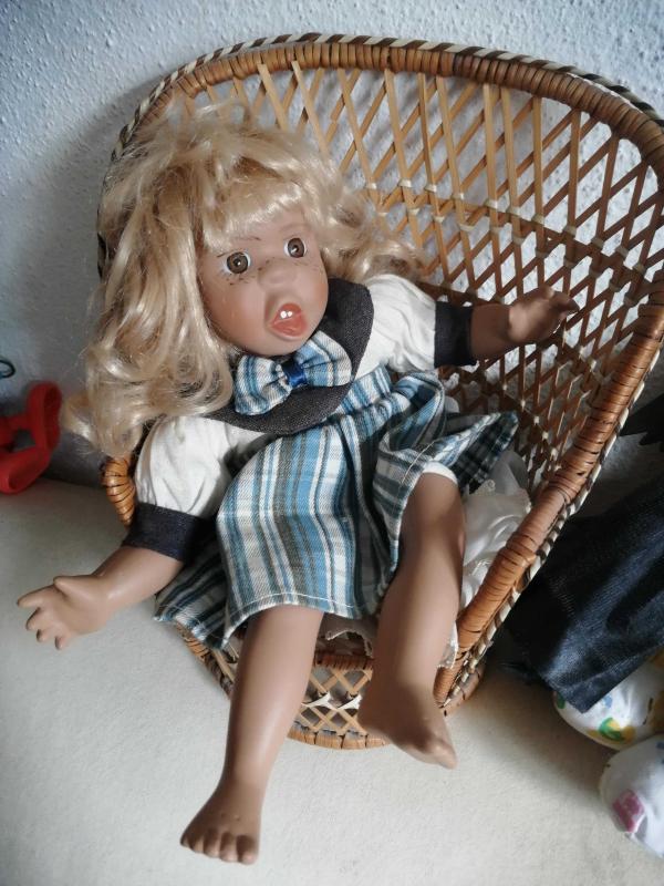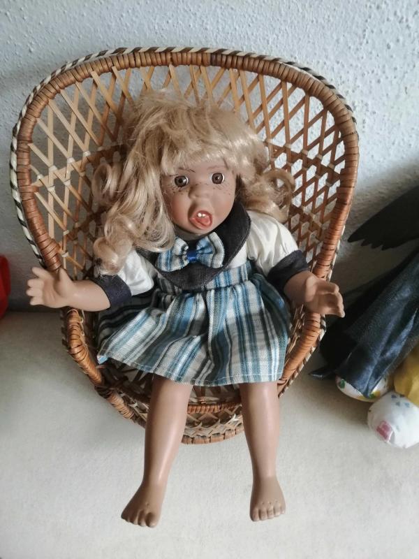 SARIŞIN PORSELEN BEBEK KARAKTER BEBEK, DİLİNİ ÇIKARMIŞ BOY 30 CM sandalye satışa dahil değildir başlıklı antika/koleksiyon objesi Avrupa menşe’lidir. 1950-1999 arası dönemine aittir.