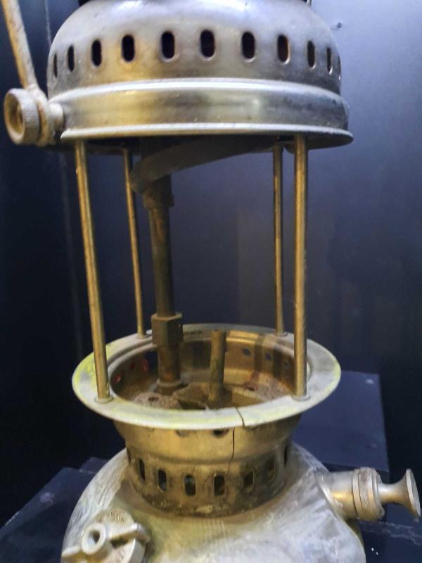 SWEDEN DAMGALI PRİMUS/OPTİMUS tarzı isveç üretimi basınçlı gaz lambası 1900 lü yıllar savaş döneminde karargah aydınlatmasında kullanılmış KONDİSYONU ÇOK İYİ SADECE CAMI YOK yükseklik 31 cm