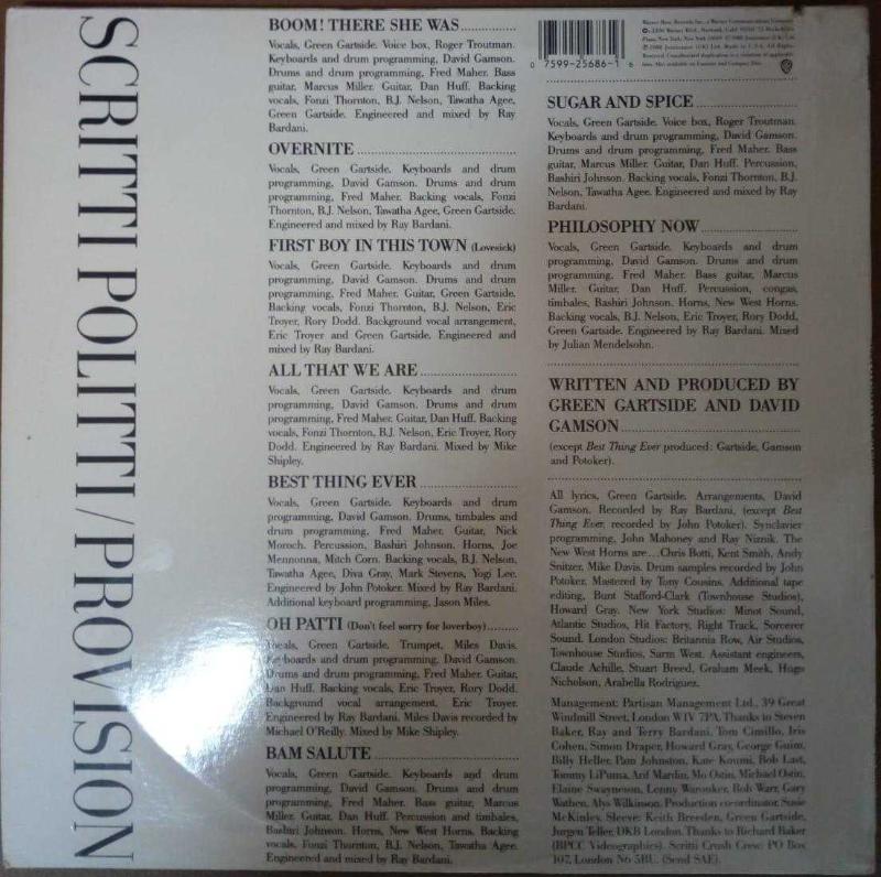 SCRITTI POLITTI(PROVISION)33'LÜK PLAK SIDE-A 1-BOOM! THERE SHE WAS 2-OVERNITE 3-FIRST BOY IN THIS TOWN 4-ALL THAT WE ARE 5-BEST THING EVER SIDE-B 1-OH PATTI 2-BAM SALUTE 3-SUGAR AND SPICE 4-PHILOSOPHY NOW PLAK KONDİSYON:10/8 KAPAK KONDİSYON:10/7 İNGİLTERE DÖNEM BASKI.1988 ORİJİNAL İÇ ZARFINDA NOT!!!!:PLAKLARIMIZIN KONDİSYONUNU BELİRLEMEDEN ÖNCE DİNLİYOR.ATLAMA VE BUNA BENZER KUSUR BULURSAK BELİRTİYORUZ. HASSAS İĞNELİ PİKAPLAR KENDİ PİKAPLARIMIZDA DUYULMAYAN KUSURLARI HİSSETTİREBİLİR.