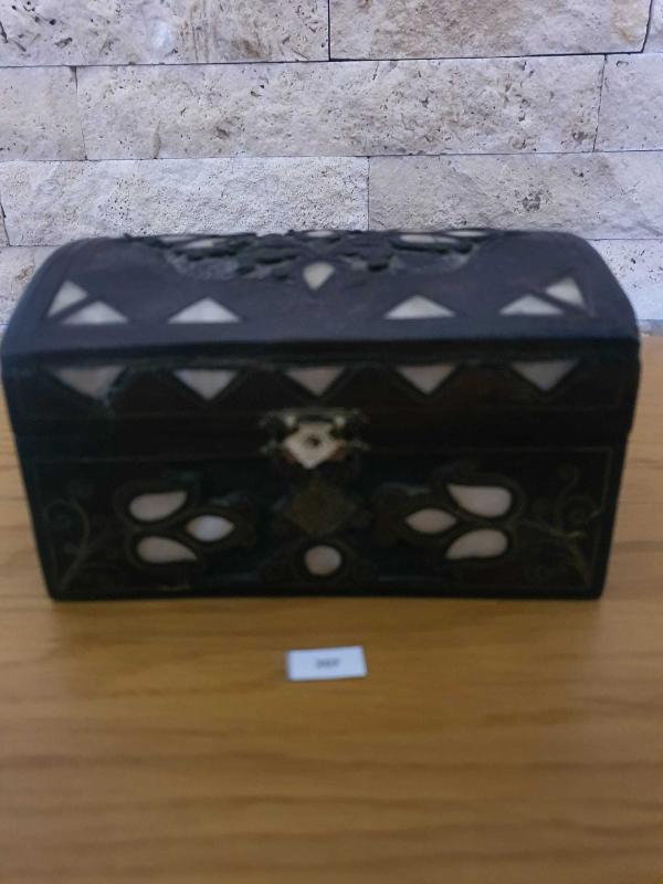 Tamamen ahşap oyma el yapımı üzeri kazıma desenli Sedef kakmalı Lale motifli Osmanlı işi içi koyu yeşil kadife kaplı takı kutusu 1960 lar 10x15x9