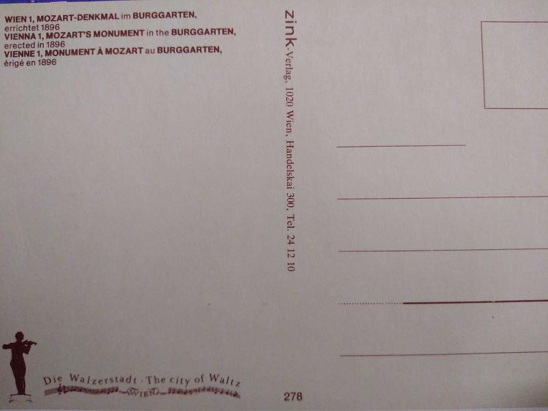 ŞEHİR KARTPOSTALI-AVUSTURYA/VİYANA BURGGARTEN MOZART ANITI GÜNDÜZ GÖRÜNTÜSÜ,ARKASINA YAZILMAMIŞ,RENKLİ, 11 X 15 CM EBADINDA - 1950'LER, 1960'LAR, 1970'LER, 1980'LER, en son 8 ay önce güncellenmiştir.