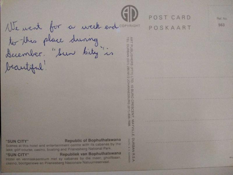 ŞEHİR KARTPOSTALI-BOPHUTHATSWANA/SUN CITY DENİZ KUMSAL OTEL VE KUMARHANELERİN GÜNDÜZ GÖRÜNTÜSÜ,ARKASINA YAZILMIŞ,RENKLİ, 11 X 15 CM EBADINDA - 1950'LER, 1960'LAR, 1970'LER, 1980'LER, 1 yıl önce satışa sunulmuştur.