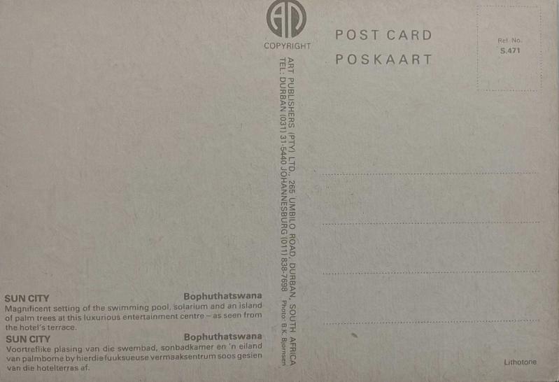 ŞEHİR KARTPOSTALI-BOPHUTHATSWANA/SUN CITY GÖL OTEL VE HAVUZ GÜNDÜZ GÖRÜNTÜSÜ,ARKASINA YAZILMAMIŞ,RENKLİ, 11 X 15 CM EBADINDA - 1950'LER, 1960'LAR, 1970'LER, 1980'LER, 1 yıl önce satışa sunulmuştur.