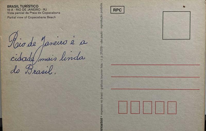 ŞEHİR KARTPOSTALI-BREZİLYA/RIO DE JANEIRO COPACABANA KUMSALININ VE DENİZİN YUKARIDAN GÜNDÜZ GÖRÜNTÜSÜ,ARKASINA YAZILMIŞ,RENKLİ, 11 X 15 CM EBADINDA - 1950'LER, 1960'LAR, 1970'LER, 1980'LER, en son 7 ay önce güncellenmiştir.