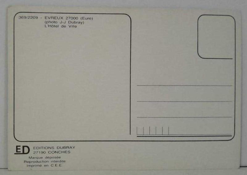 ŞEHİR KARTPOSTALI-FRANSA/EVREUX BELEDİYE BİNASI GÜNDÜZ GÖRÜNTÜSÜ,ARKASINA YAZILMAMIŞ, RENKLİ, 12 X 16 CM EBADINDA - 1950'LER, 1960'LAR, 1970'LER, 1980'LER, en son 8 ay önce güncellenmiştir.