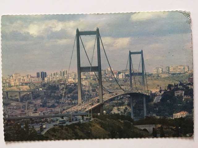 ŞEHİR KARTPOSTALI, İSTANBUL BOĞAZ KÖPRÜSÜNÜN ESKİ BİR FOTOĞRAFI, ARKASI YAZILI, RENKLİ, 10 X 15 CM EBADINDA - 1940'LAR, 1950'LER, 1960'LAR, 1970'LER 1980'LER, en son 8 ay önce güncellenmiştir.