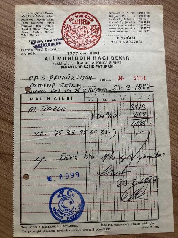 ŞEKER FATURASI - 23 ŞUBAT 1987 - ALİ MUHİDDİN HACIBEKİR - ŞEKERCİLİK TİC.A.Ş. - BEYOĞLU, İSTANBUL - OSMAN FAHİR SEDEN, O.F.S. PRODÜKSİYON - BEYOĞLU, İSTANBUL - ISLAK İMZALI, KAŞELİ - 14 x 20 cm EBATLI ORİJİNAL FATURA - TÜRK SİNEMA - FİLM TARİHİ, 11 ay önce satışa sunulmuştur.