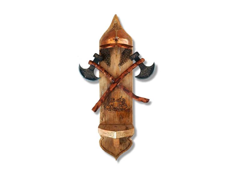 yıllanmış ahşap gövde üzerinde metal işlemeli baltalar, selçuklu miğferi.