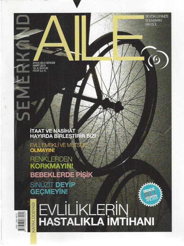 Kitap 2013 yılında SEMERKAND BASIM YAYIN tarafından [İSTANBUL] 1306-0872 ISBN kodu ile yayınlanmıştır. 56 sayfadır. SEMERKAND AİLE - AYLIK AİLE DERGİSİ SAYI 90 MART 2013 EVLİLİKLERİN HASTALIKLA İMTİHANI, SİNÜZİT DEYİP GEÇMEYİN, RENKLERDEN KORKMAYIN, BEBEKLERDE PİŞİK, EVLİ EMEKLİ VE MUTSUZ OLMAYIN adlı eser Türkçe dilindedir.